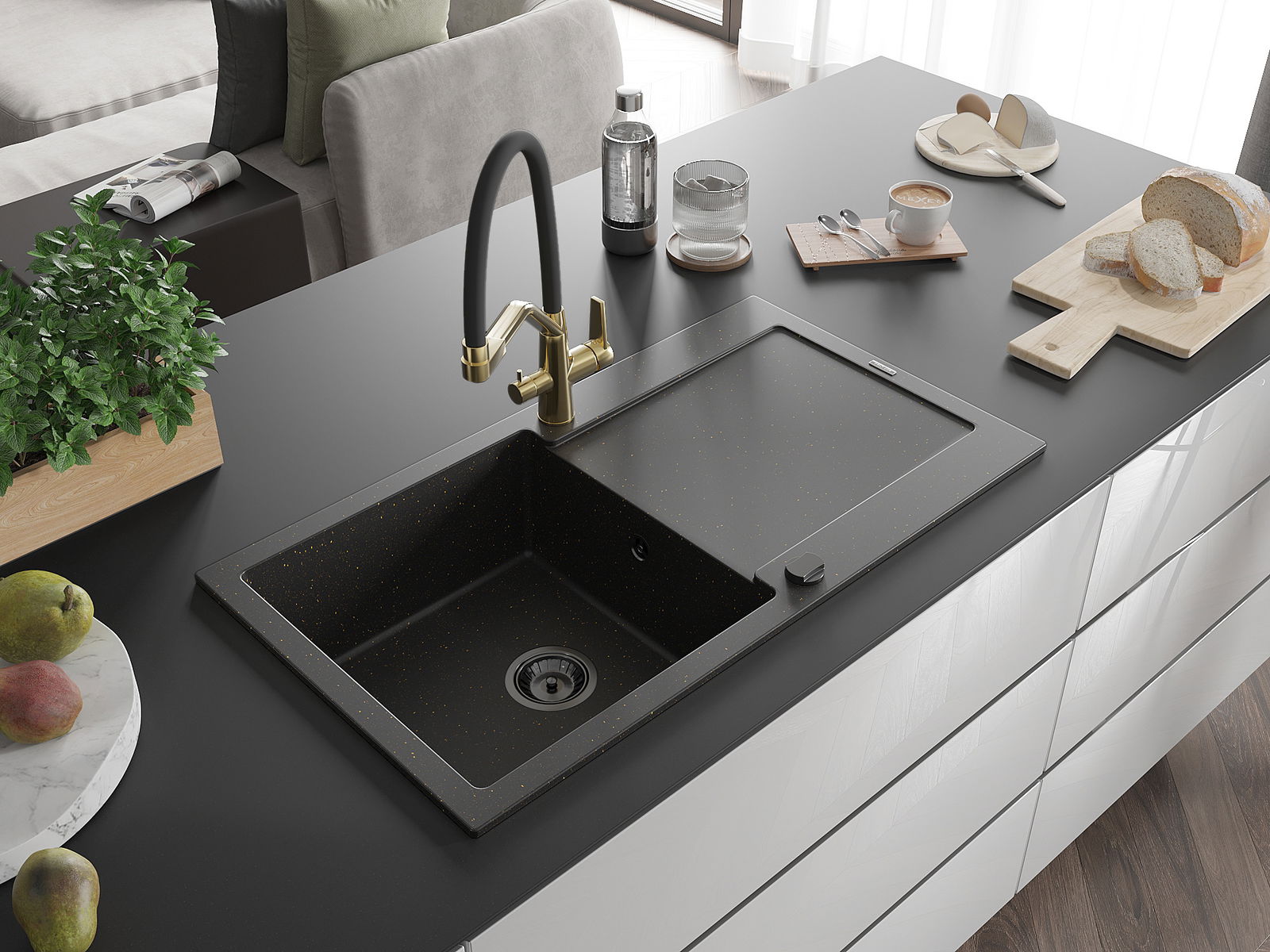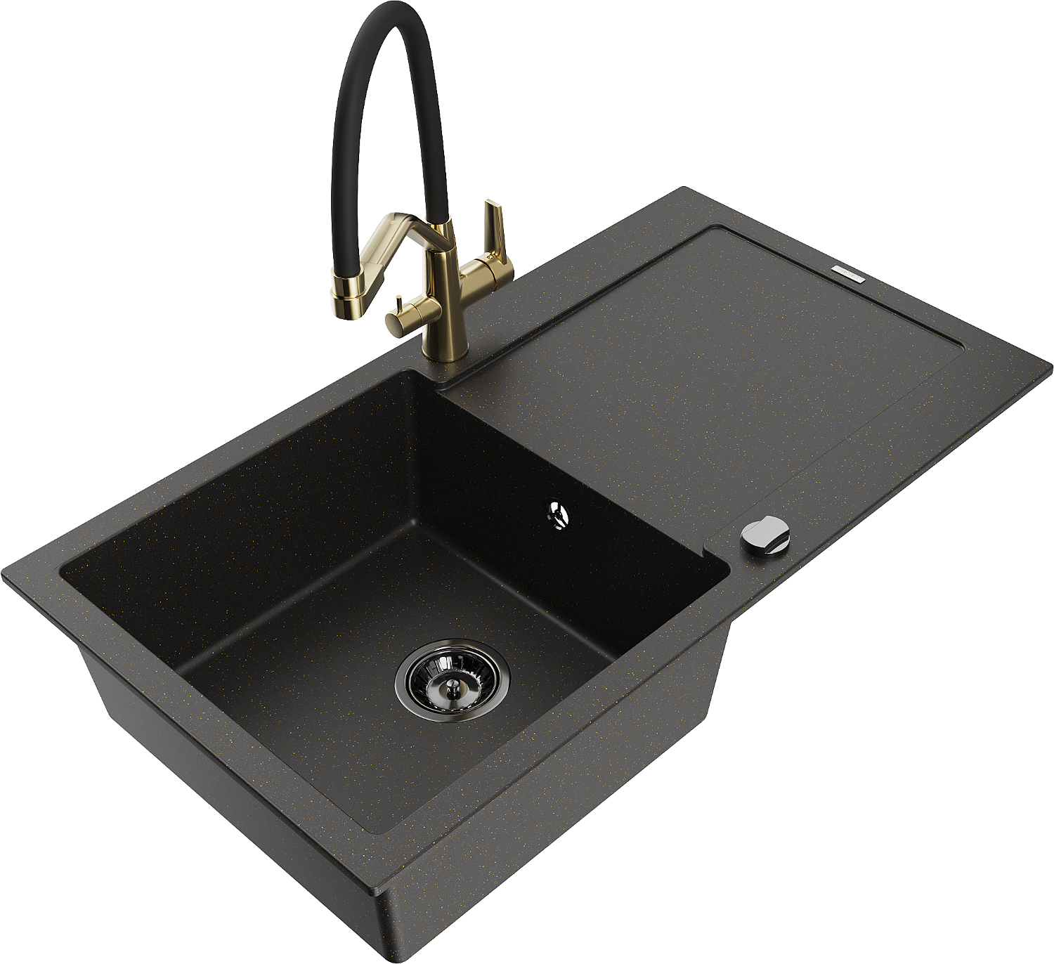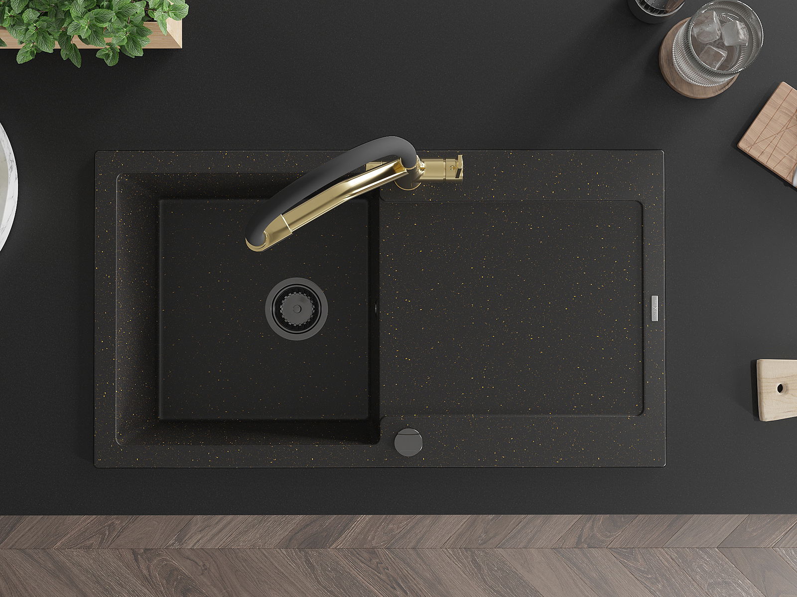 Mexen Leo granitový dřez s 1 komorou a odkapávačem a kuchyňskou baterií Duo, černý/zlatý metalický - 6501-75-671701-57-B