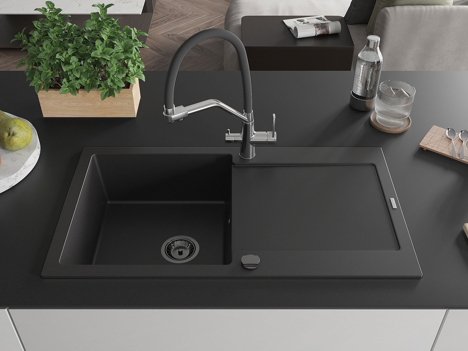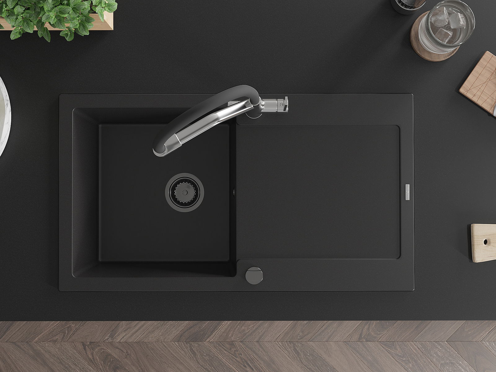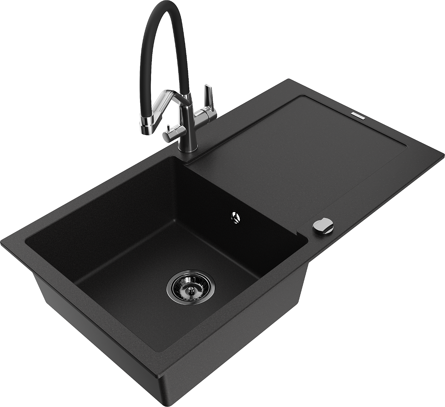 Mexen Leo granitový kuchyňský dřez 1-komorový s odkapávačem a kuchyňskou baterií Duo, černý - 6501-77-671701-07-B