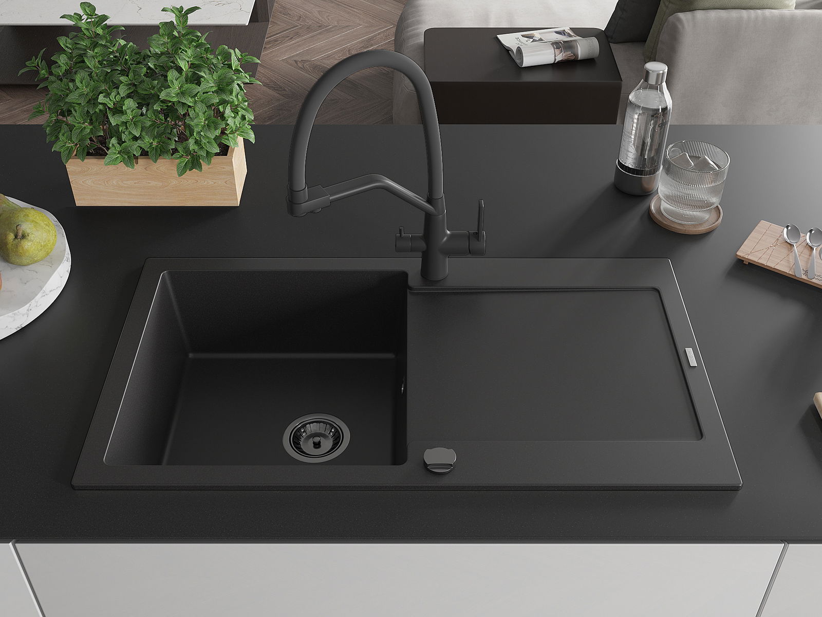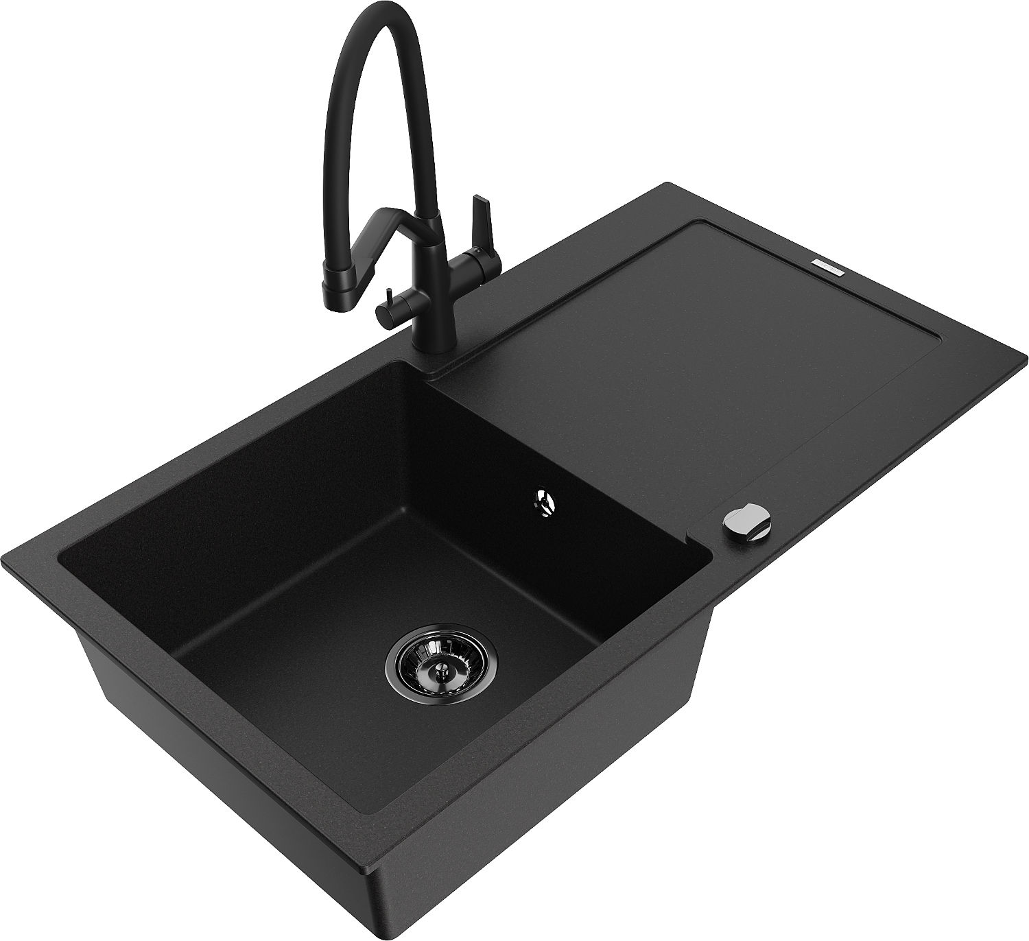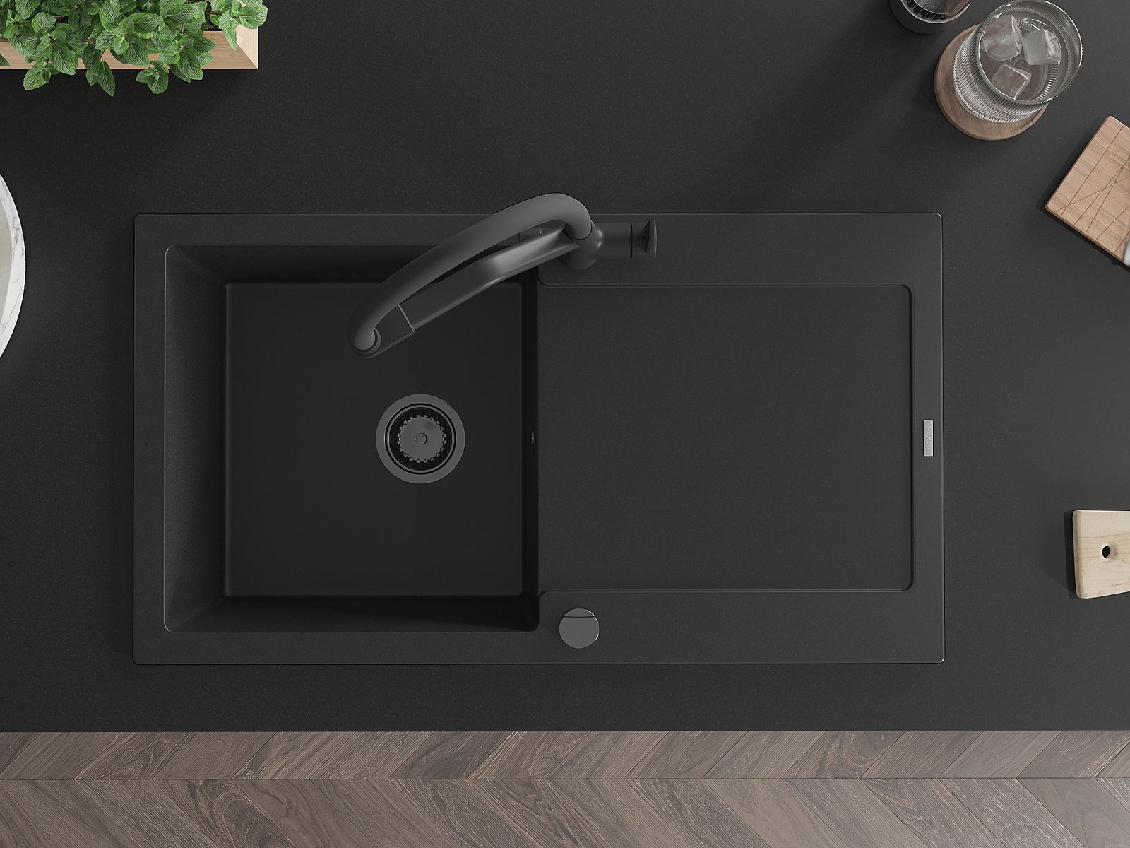 Mexen Leo granitový dřez s 1 komorou a odkapávačem a kuchyňskou baterií Duo, černý - 6501-77-671701-70-B