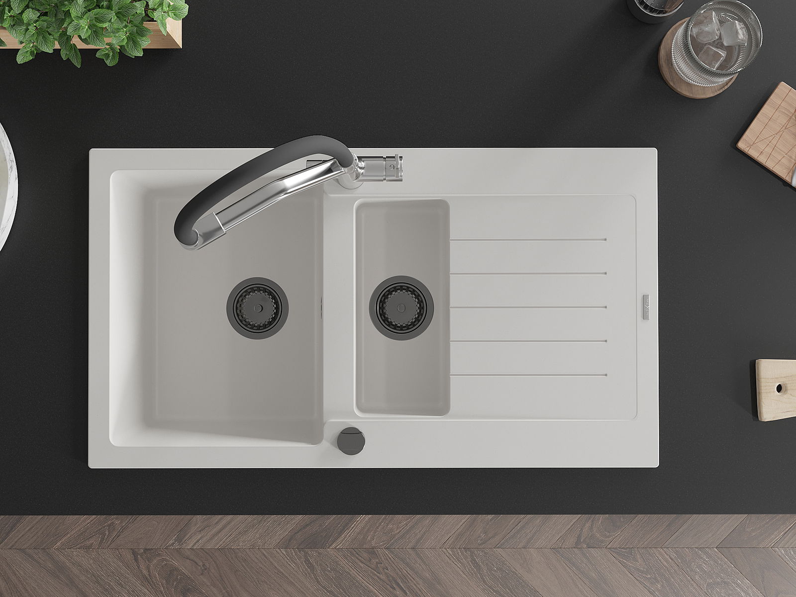 Mexen Matias žulový dřez 1,5komorový s odkapávačem a kuchyňskou baterií Duo, bílý - 6502-20-671701-07-B