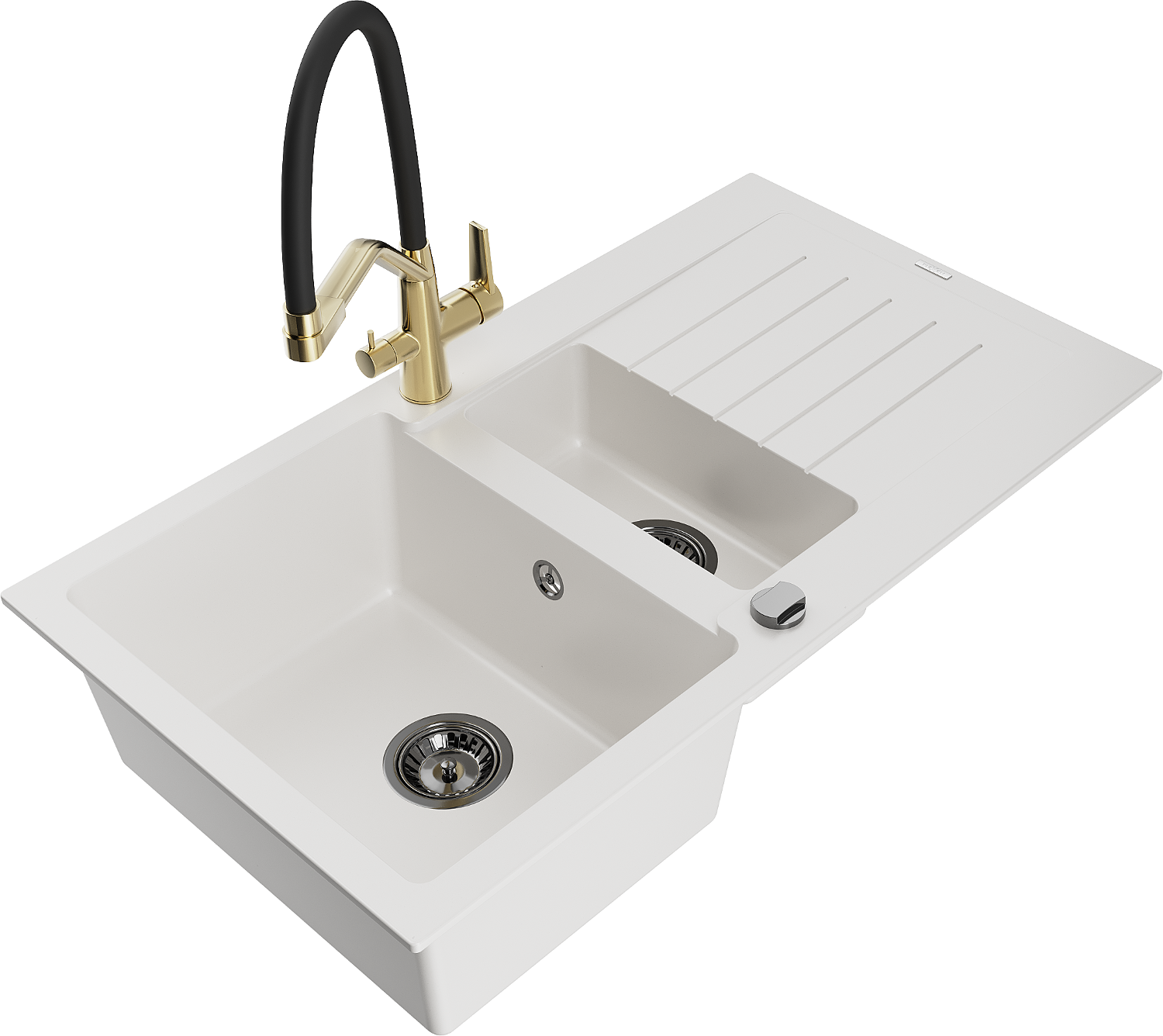 Mexen Matias žulový dřez 1,5komorový s odkapávačem a kuchyňskou baterií Duo, bílý - 6502-20-671701-57-B