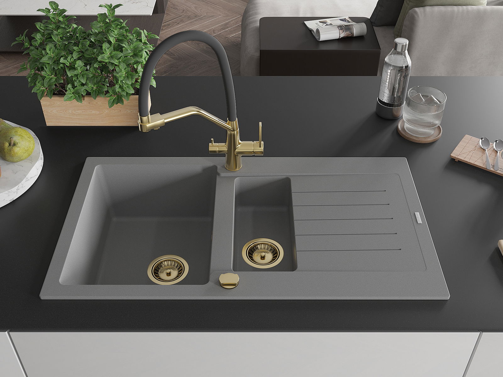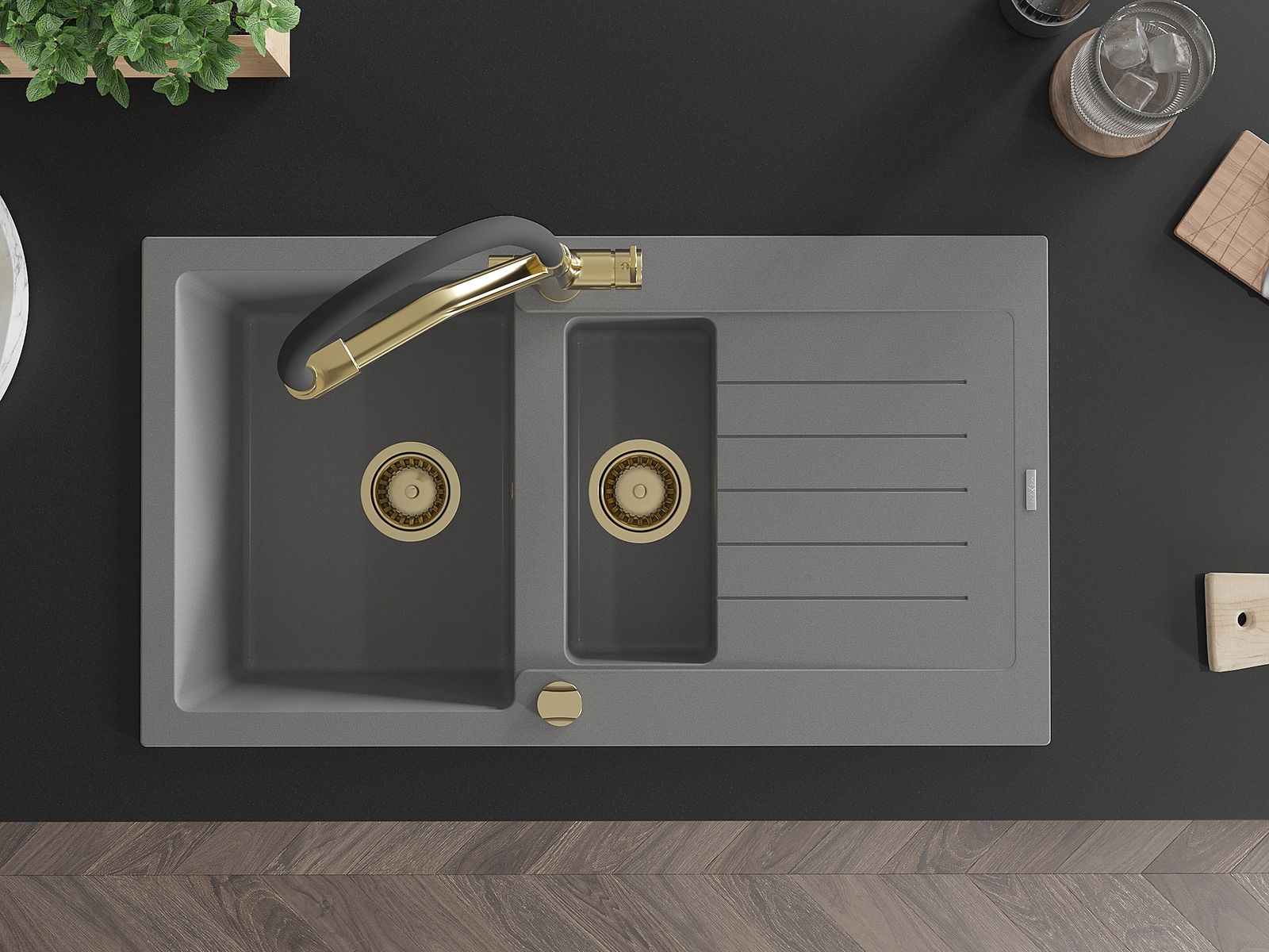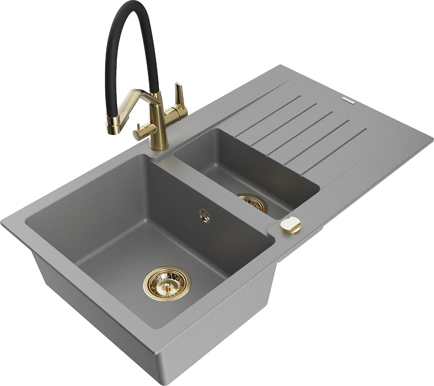 Mexen Matias granitový dřez 1,5-komorový s odkapávačem a kuchyňskou baterií Duo, šedý - 6502-71-671701-57-G