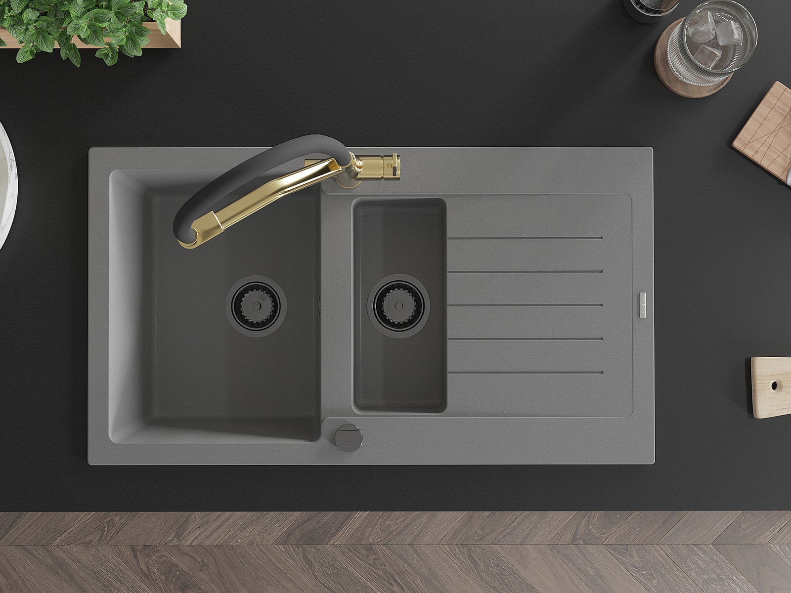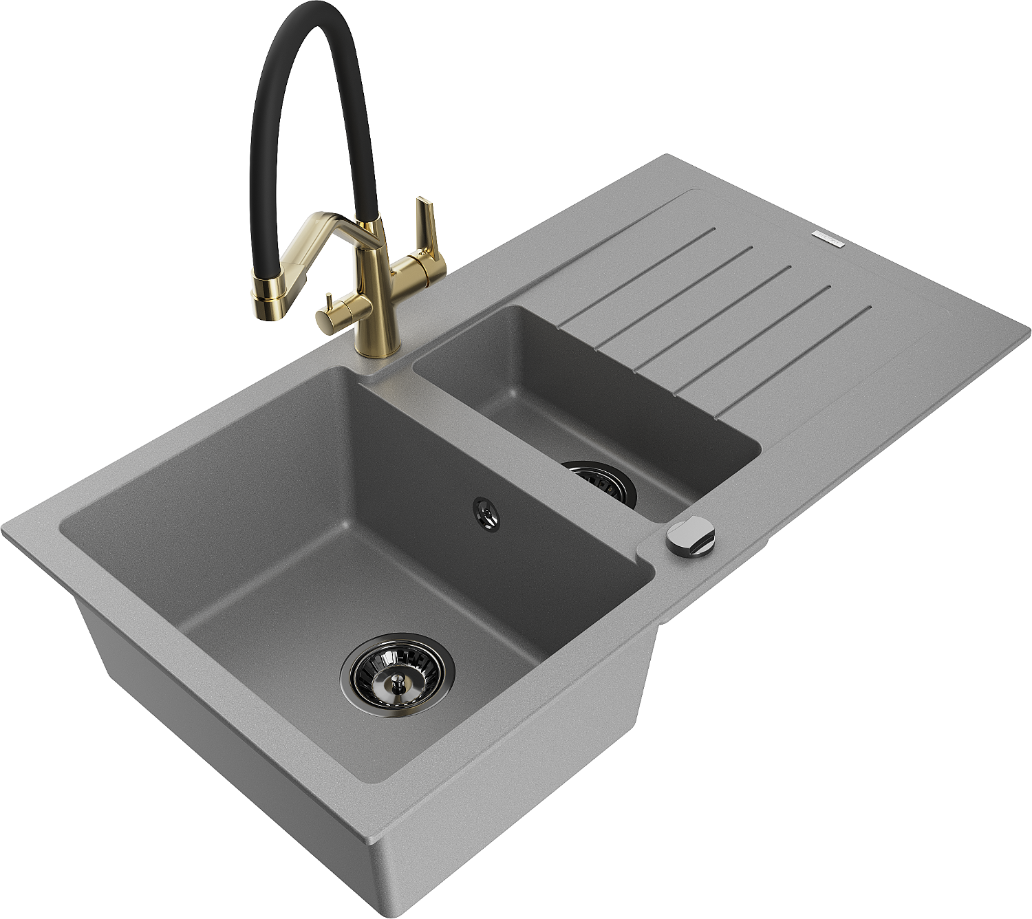 Mexen Matias žulový dřez 1,5 komorový s odkapávačem a kuchyňskou baterií Duo, šedý - 6502-71-671701-57-B