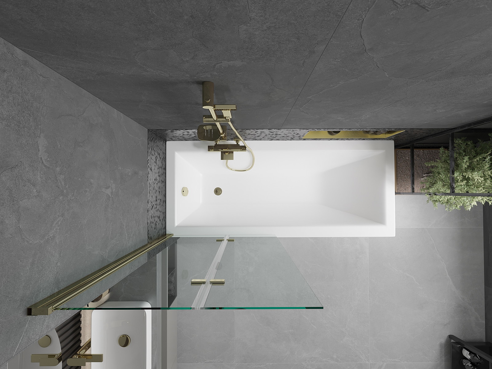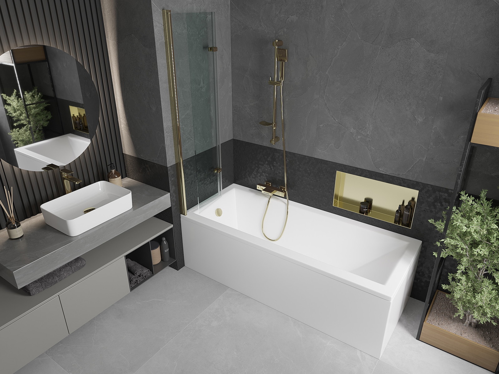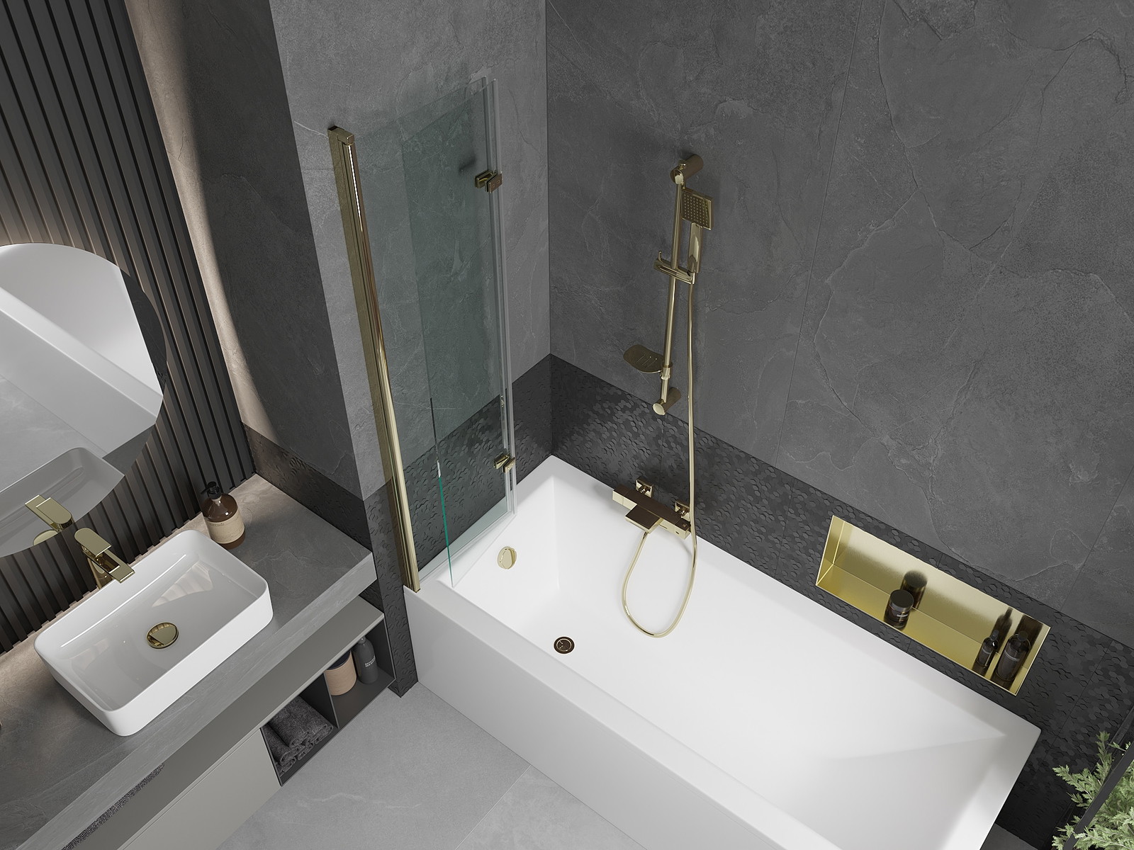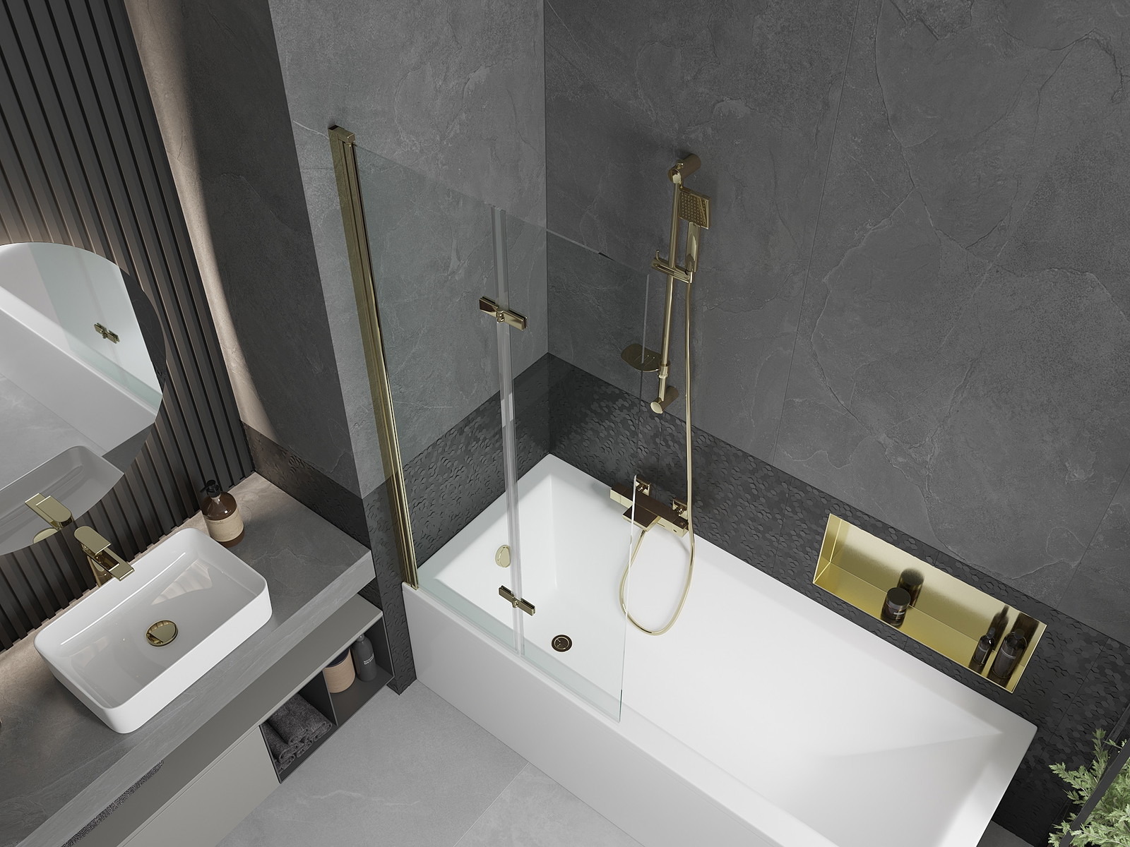 Paravan vyrobený ze dvou křídel s možností složení. Takové řešení umožňuje ušetřit více místa v koupelně a umožňuje volné využití zbývajícího prostoru, když nepoužíváme koupací zónu.