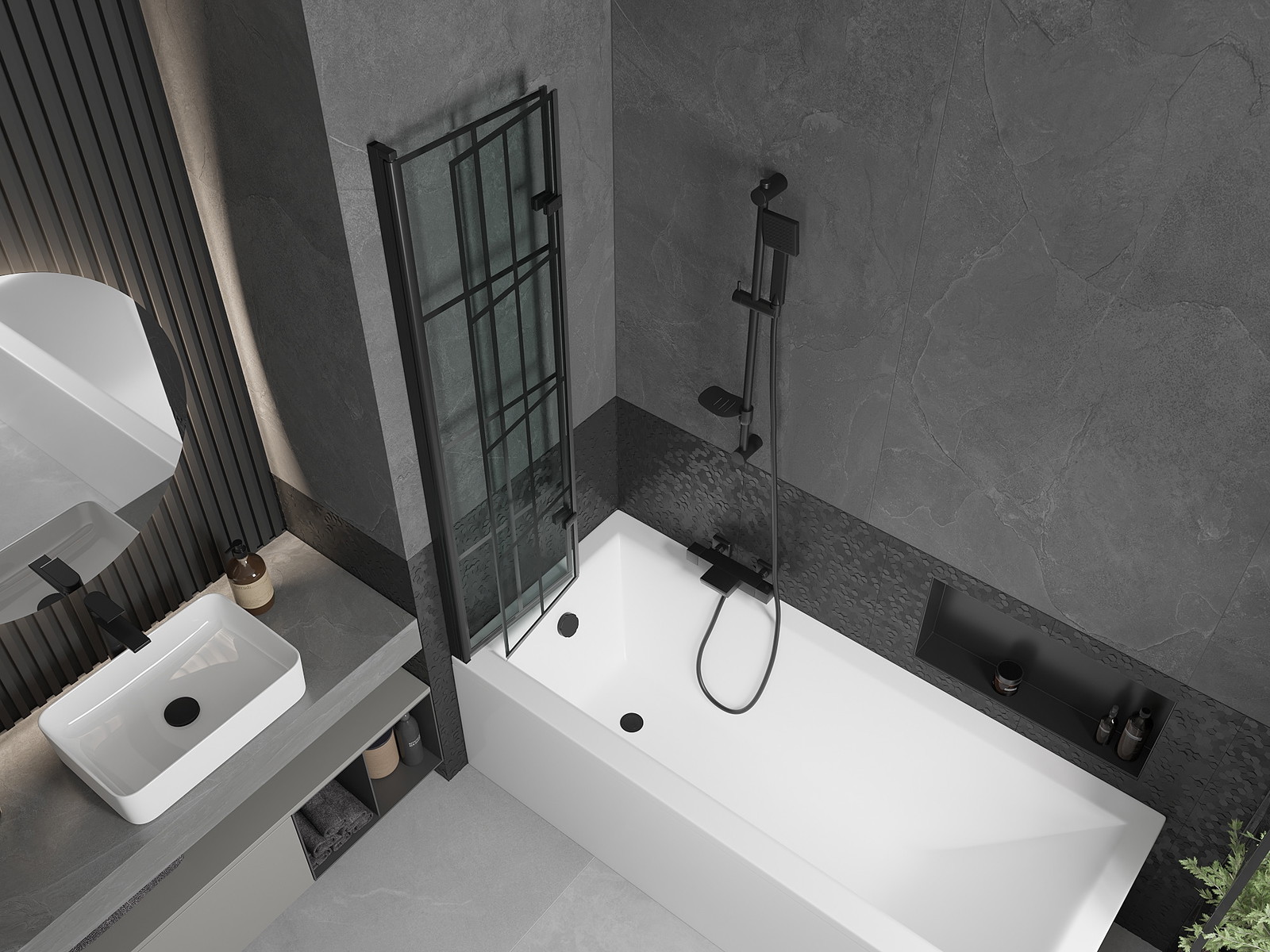 Paravan vyrobený ze dvou křídel s možností složení. Takové řešení umožňuje ušetřit více místa v koupelně a umožňuje volné využití zbývajícího prostoru, když nepoužíváme koupací zónu.