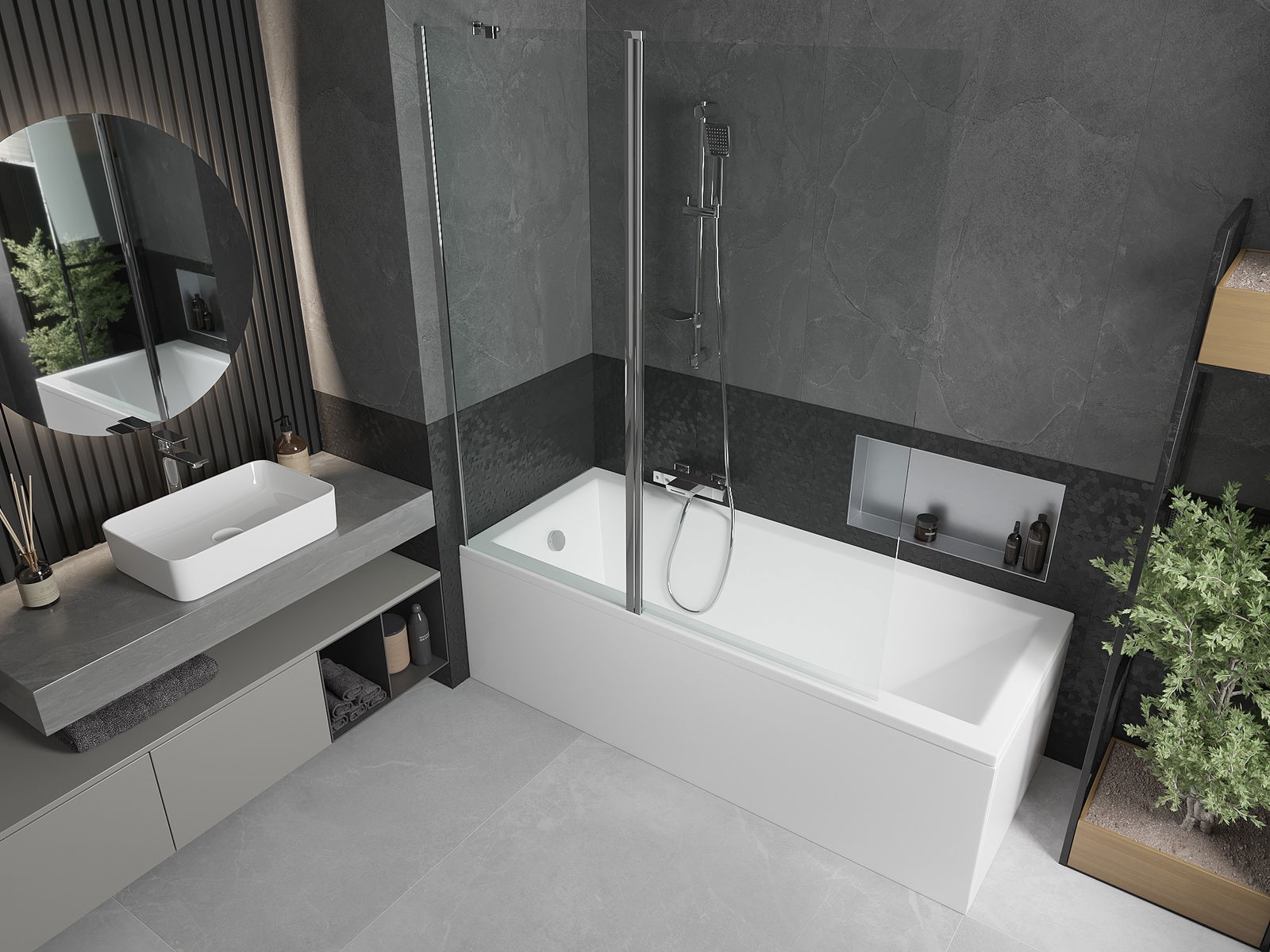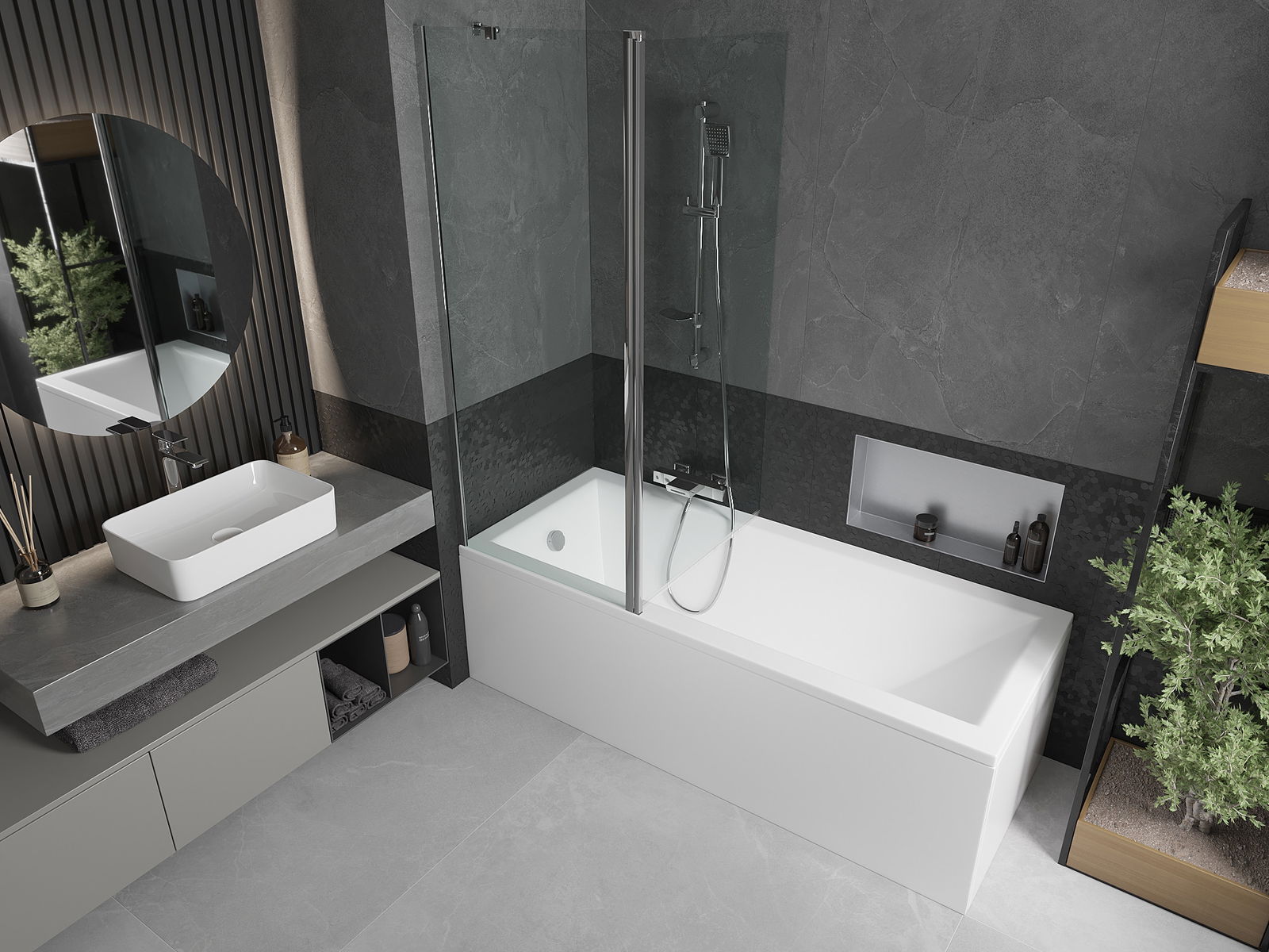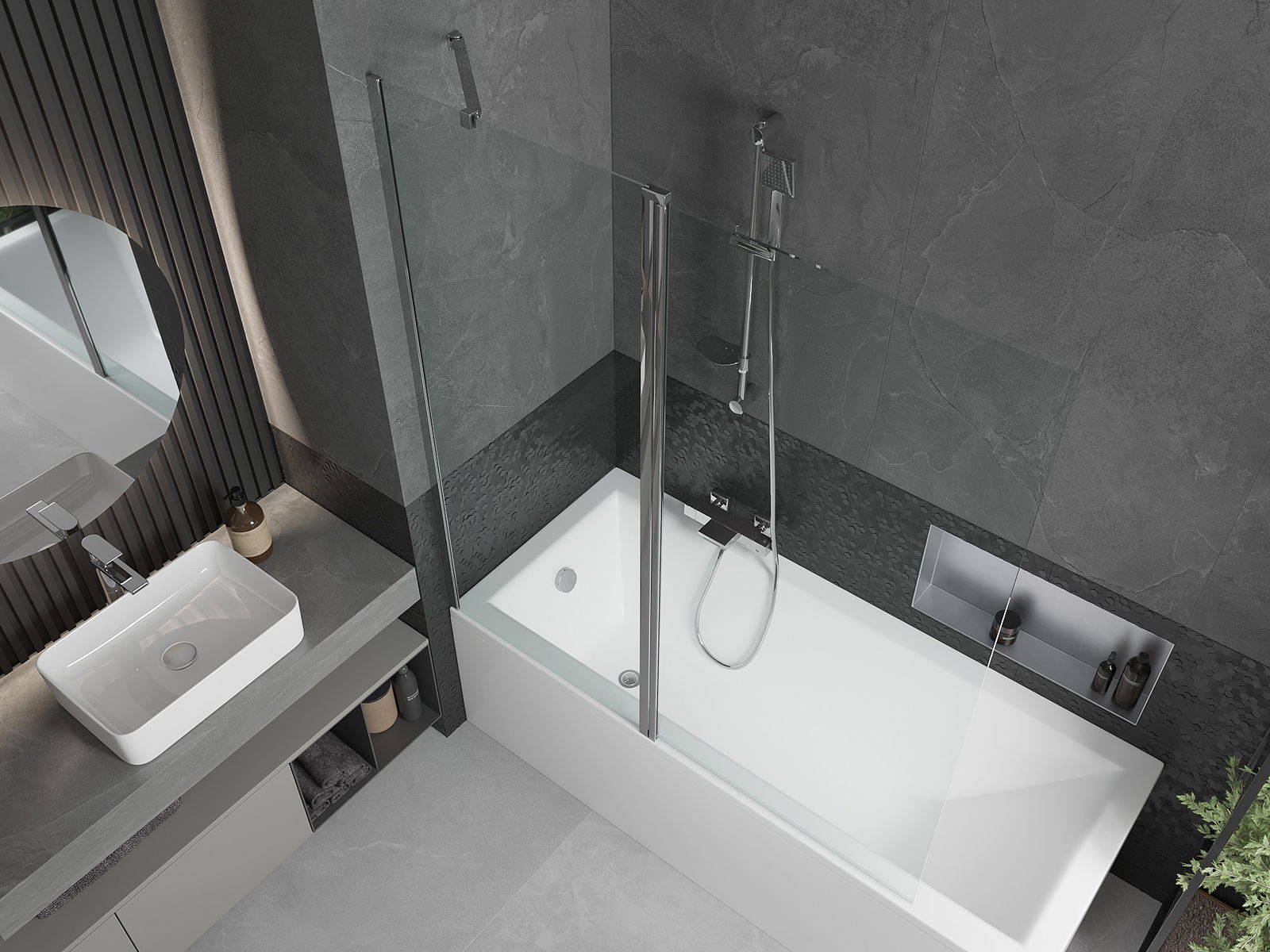 Paraván má jedno pohyblivé křídlo s možností složení. Takové řešení umožňuje ušetřit více místa v koupelně a umožňuje volné využívání zbývajícího prostoru, když nevyužíváme koupací zónu.