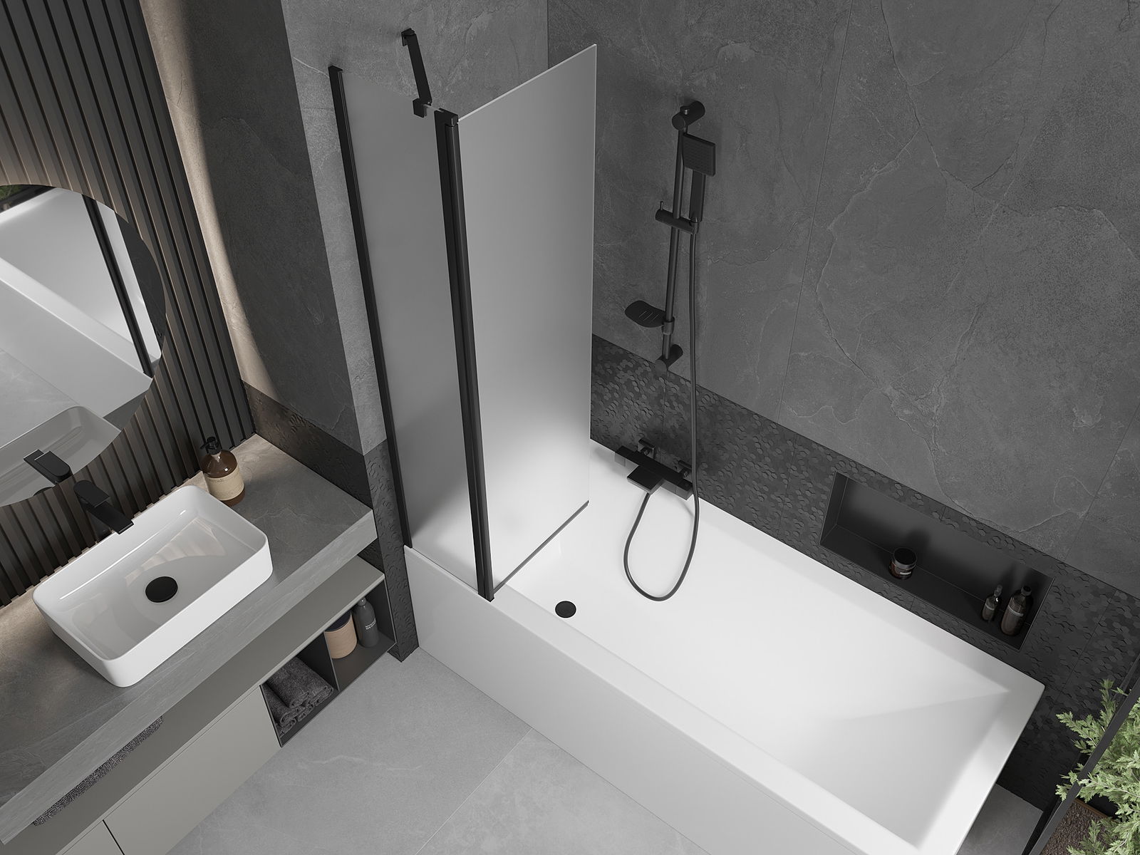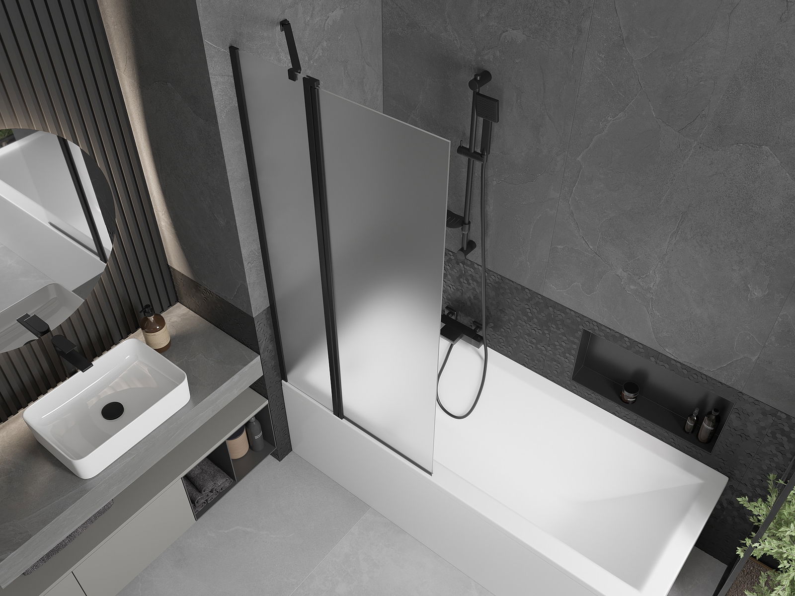 Paraván má jedno pohyblivé křídlo s možností složení. Takové řešení umožňuje ušetřit více místa v koupelně a umožňuje volné využívání zbývajícího prostoru, když nevyužíváme koupací zónu.