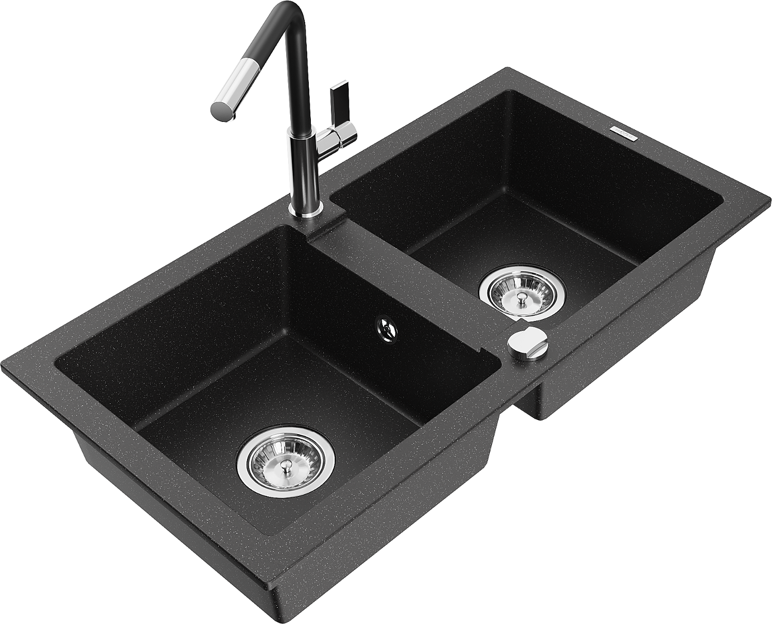 Mexen Mario dřez granitový 2-komorový s kuchyňskou baterií Flora, černý/stříbrný metalik - 6504-73-670401-07