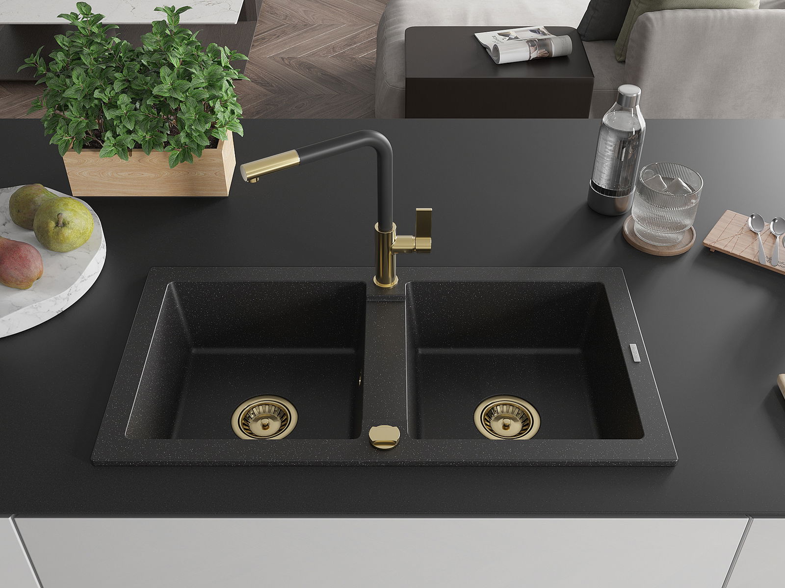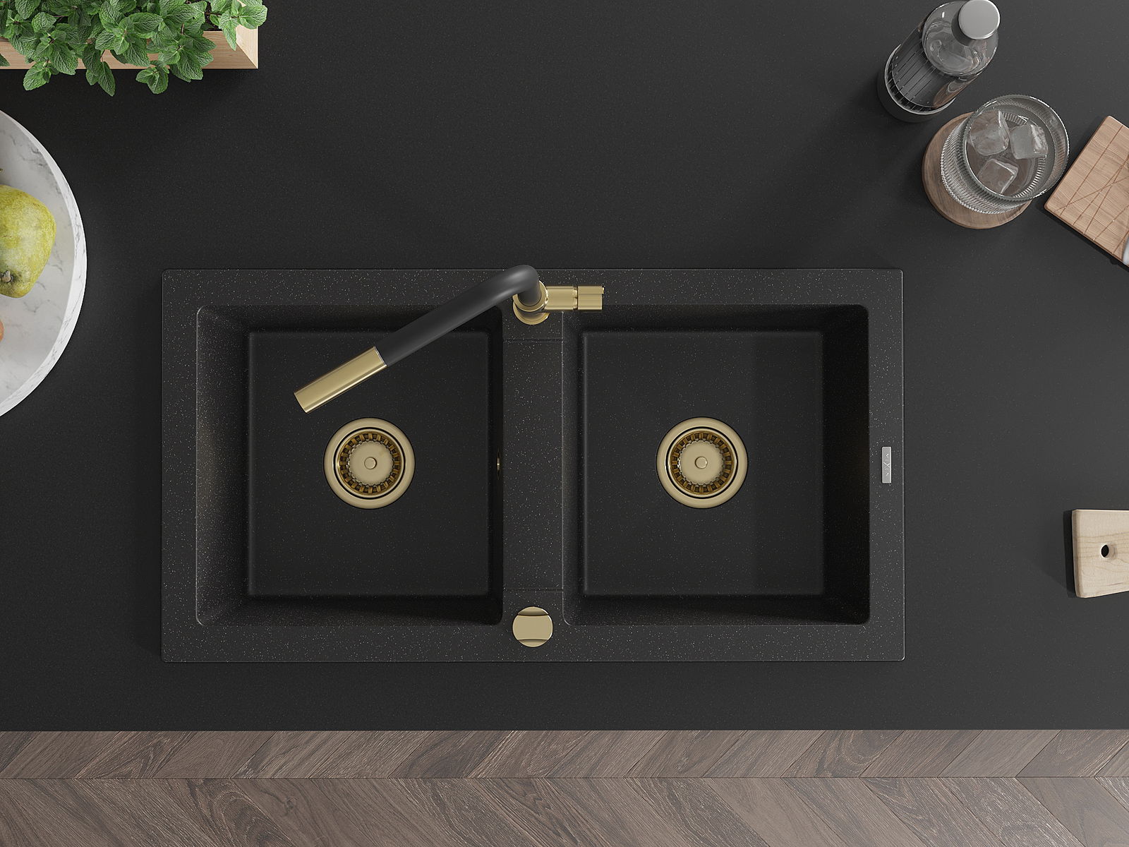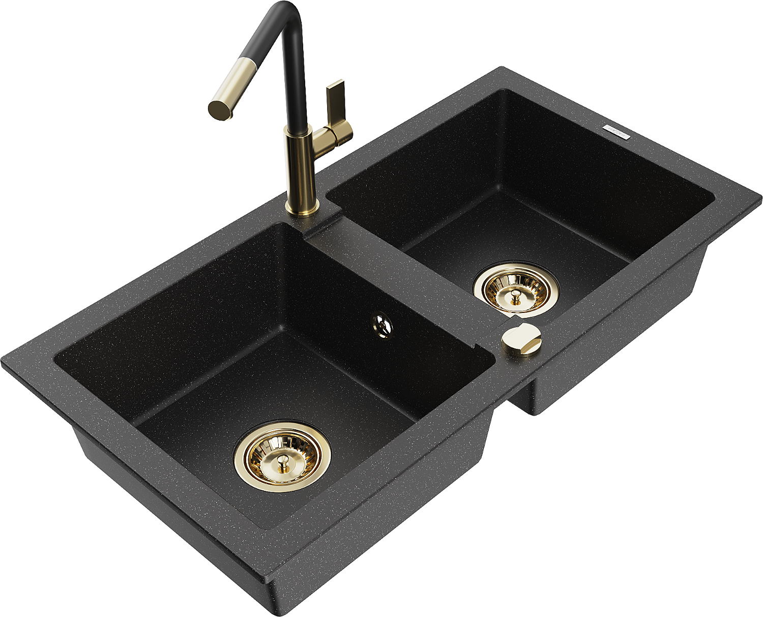 Mexen Mario dřez granitový 2-komorový s kuchyňskou baterií Flora, černý/stříbrný metalik - 6504-73-670401-57-G