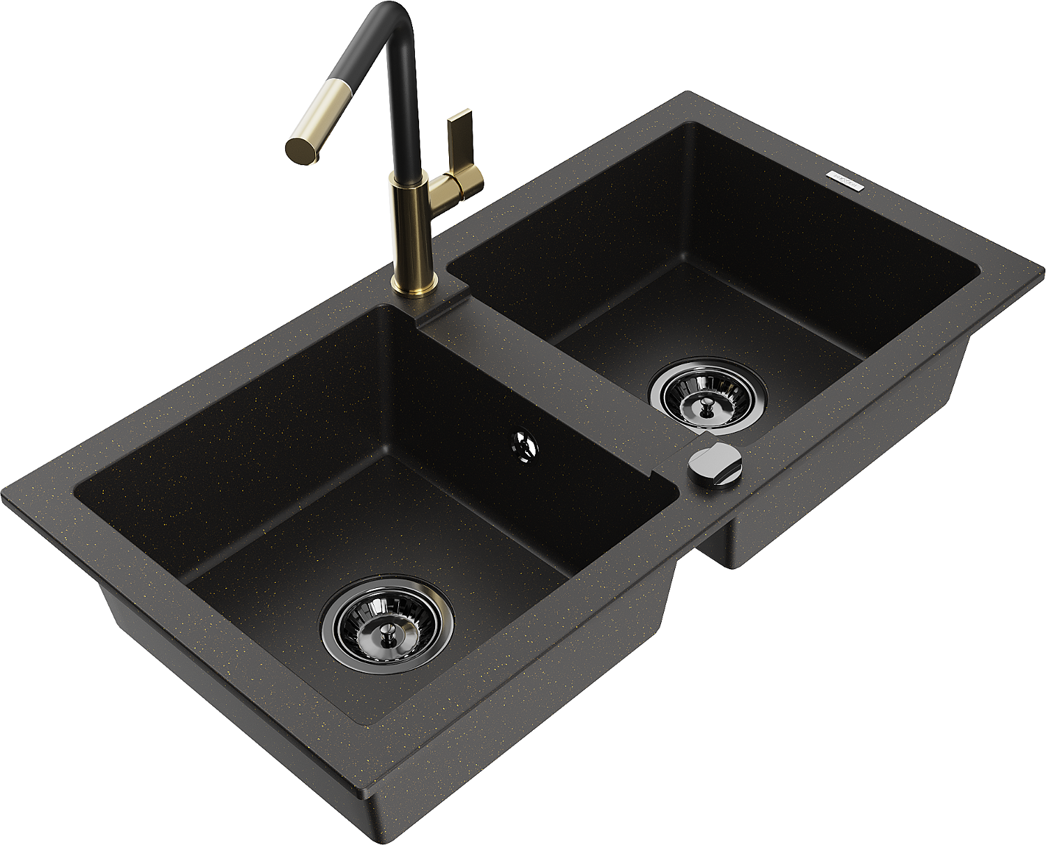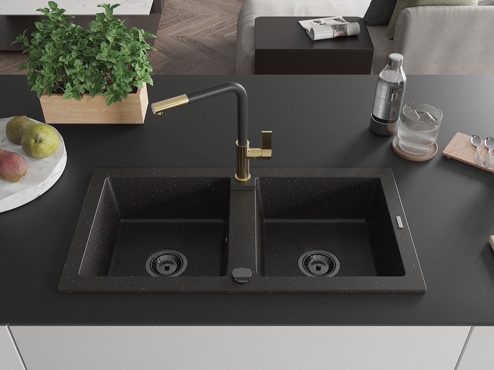 Mexen Mario granitový dřez 2-komorový s kuchyňskou baterií Flora, černý/zlatý metalik - 6504-75-670401-57-B