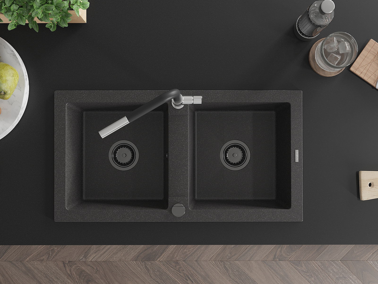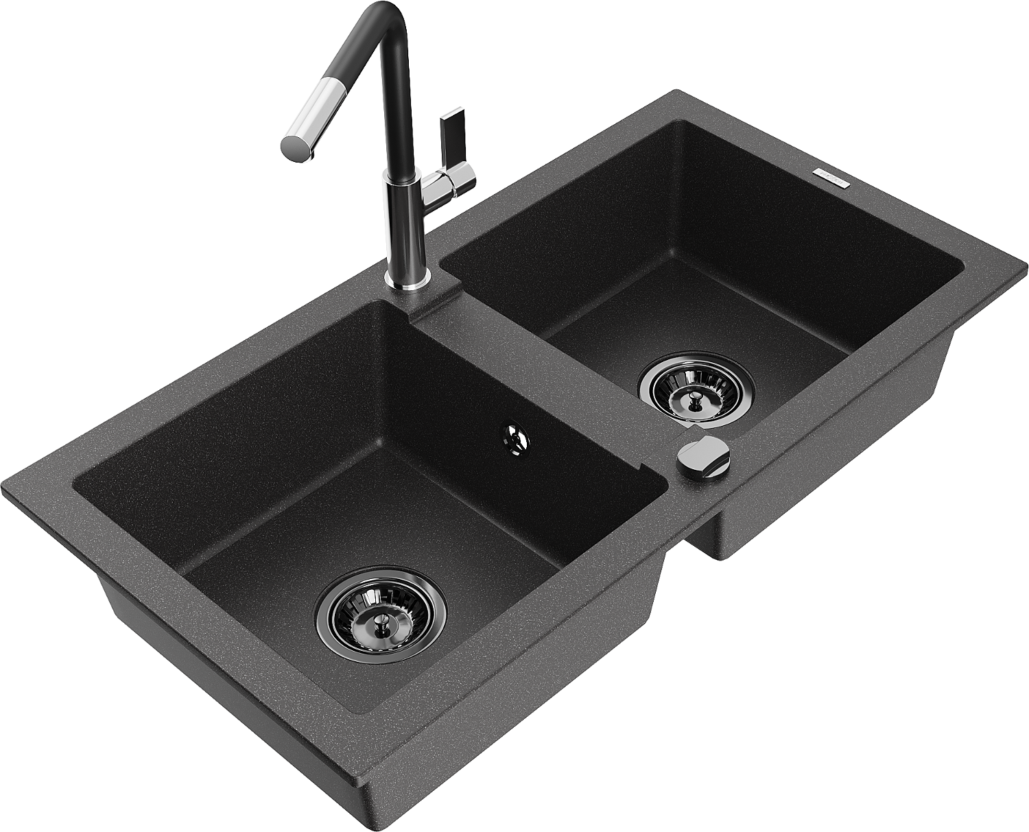 Mexen Mario granitový dřez 2-komorový s kuchyňskou baterií Flora, černý skvrnitý - 6504-76-670401-07-B