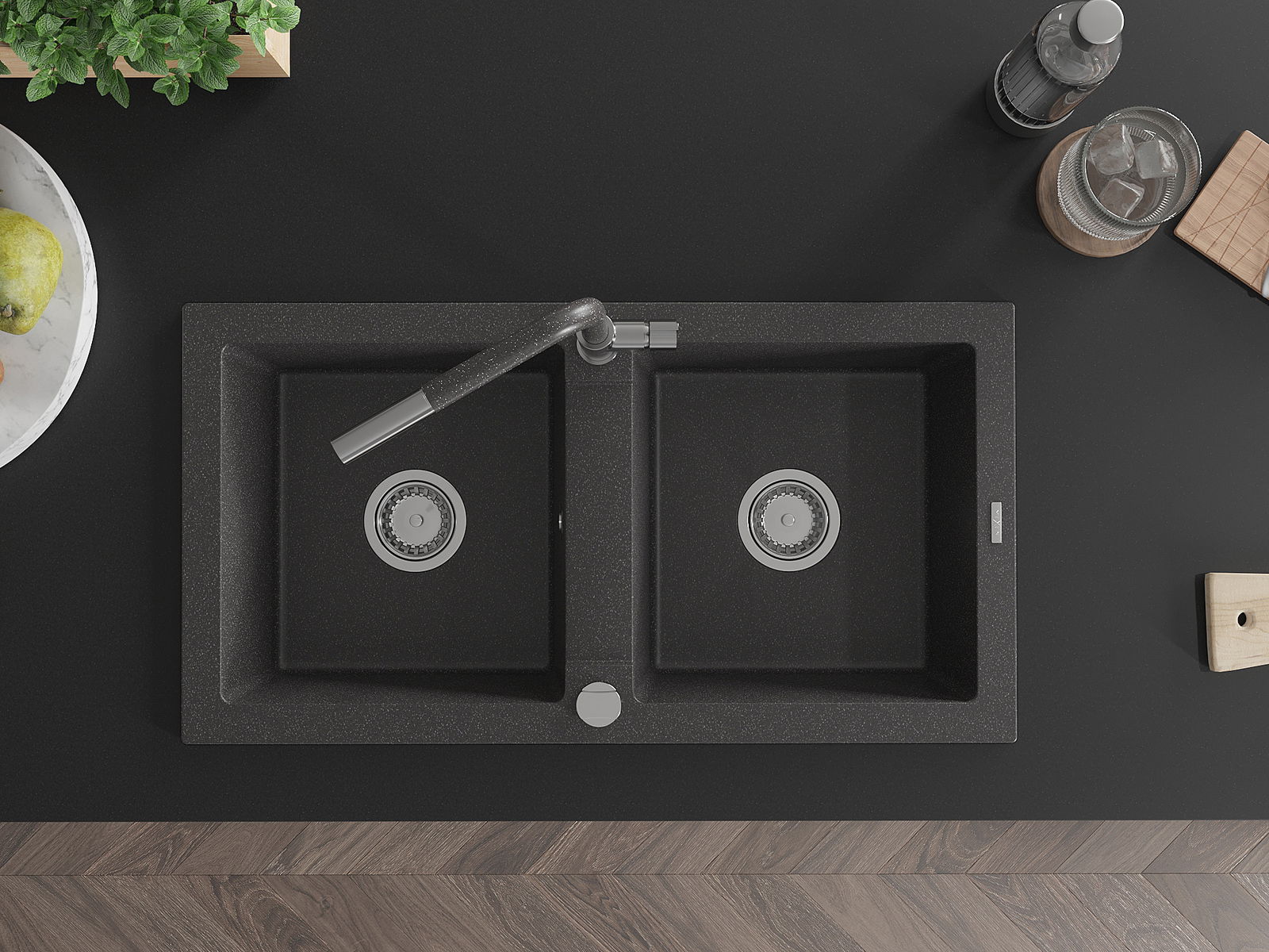 Mexen Mario dvoukomorový granitový dřez s kuchyňskou baterií Flora, černý s tečkami - 6504-76-670401-08