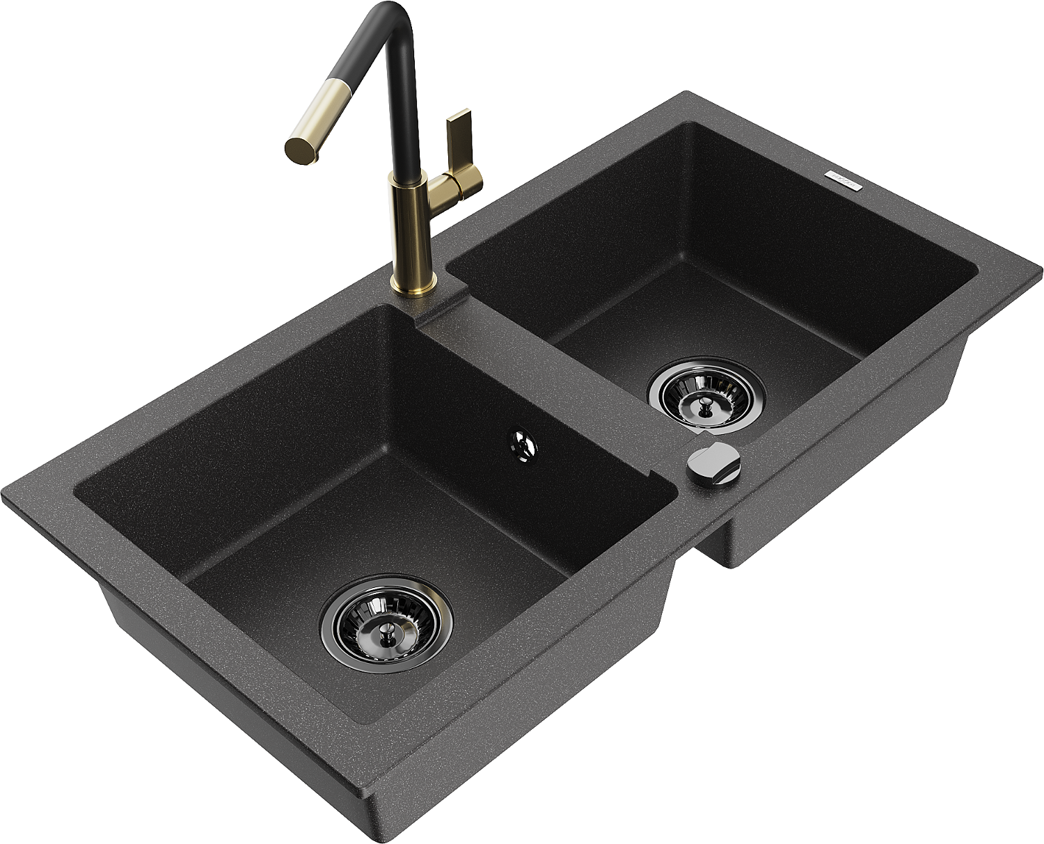 Mexen Mario dvojkomorový granitový dřez s kuchyňskou baterií Flora, černý kropenatý - 6504-76-670401-57-B