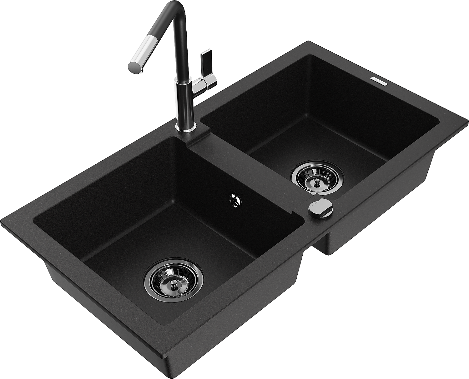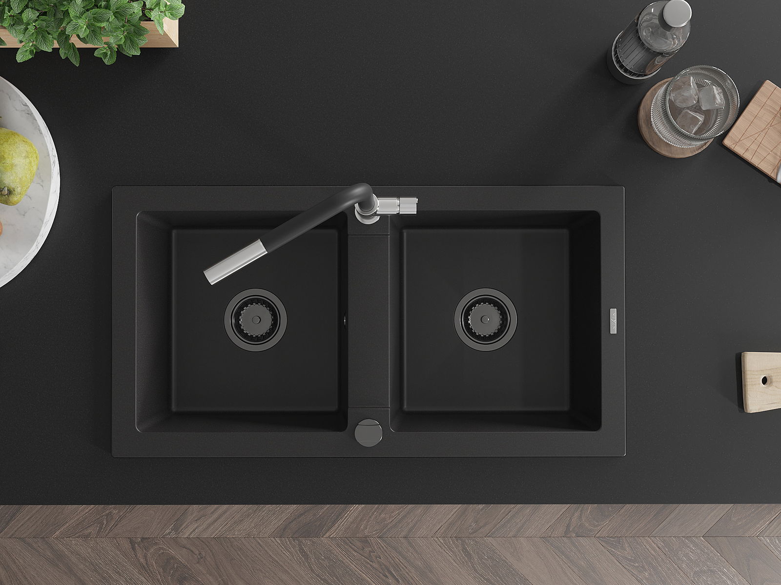 Mexen Mario granitový dřez 2-komorový s kuchyňskou baterií Flora, černý - 6504-77-670401-07-B