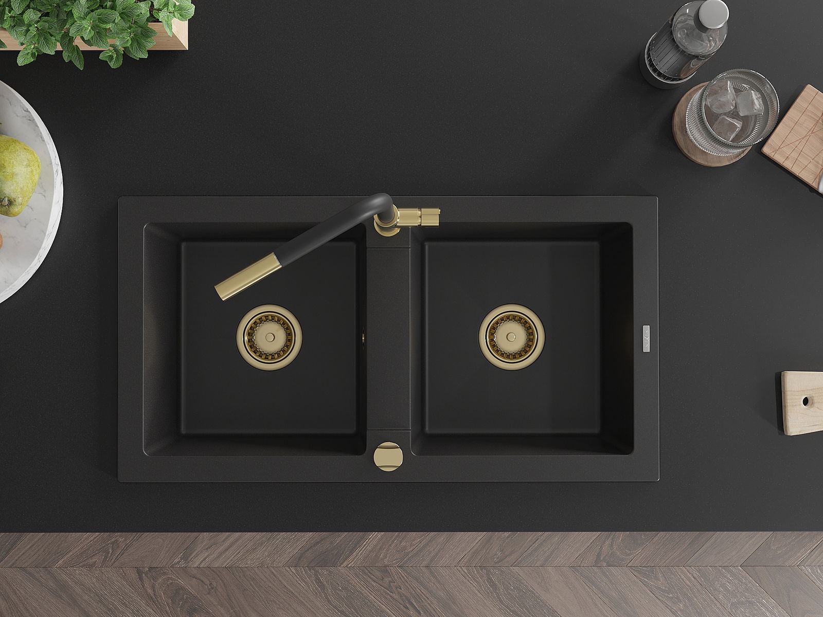 Mexen Mario granitový dřez 2-komorový s kuchyňskou baterií Flora, černý - 6504-77-670401-57-G
