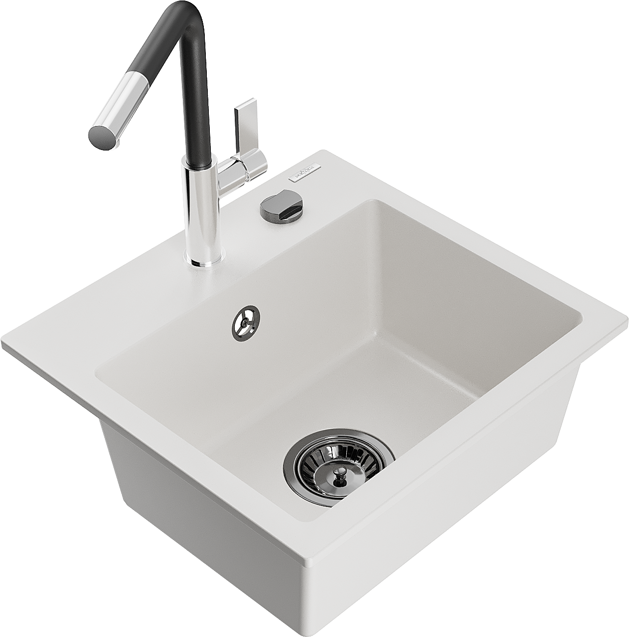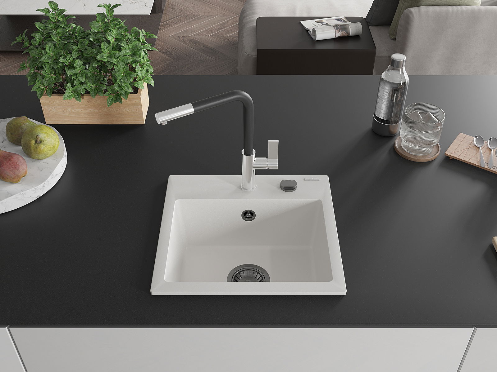 Mexen Milo granitový kuchyňský dřez 1-komorový s kuchyňskou baterií Flora, bílý - 6505-20-670401-07-B