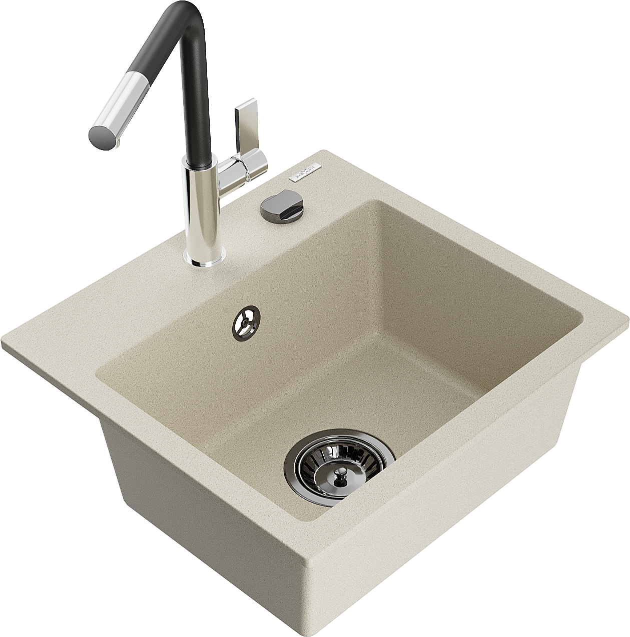 • Mexen Milo granitový dřez 1-komorový s kuchyňskou baterií Flora, béžový - 6505-69-670401-07-B