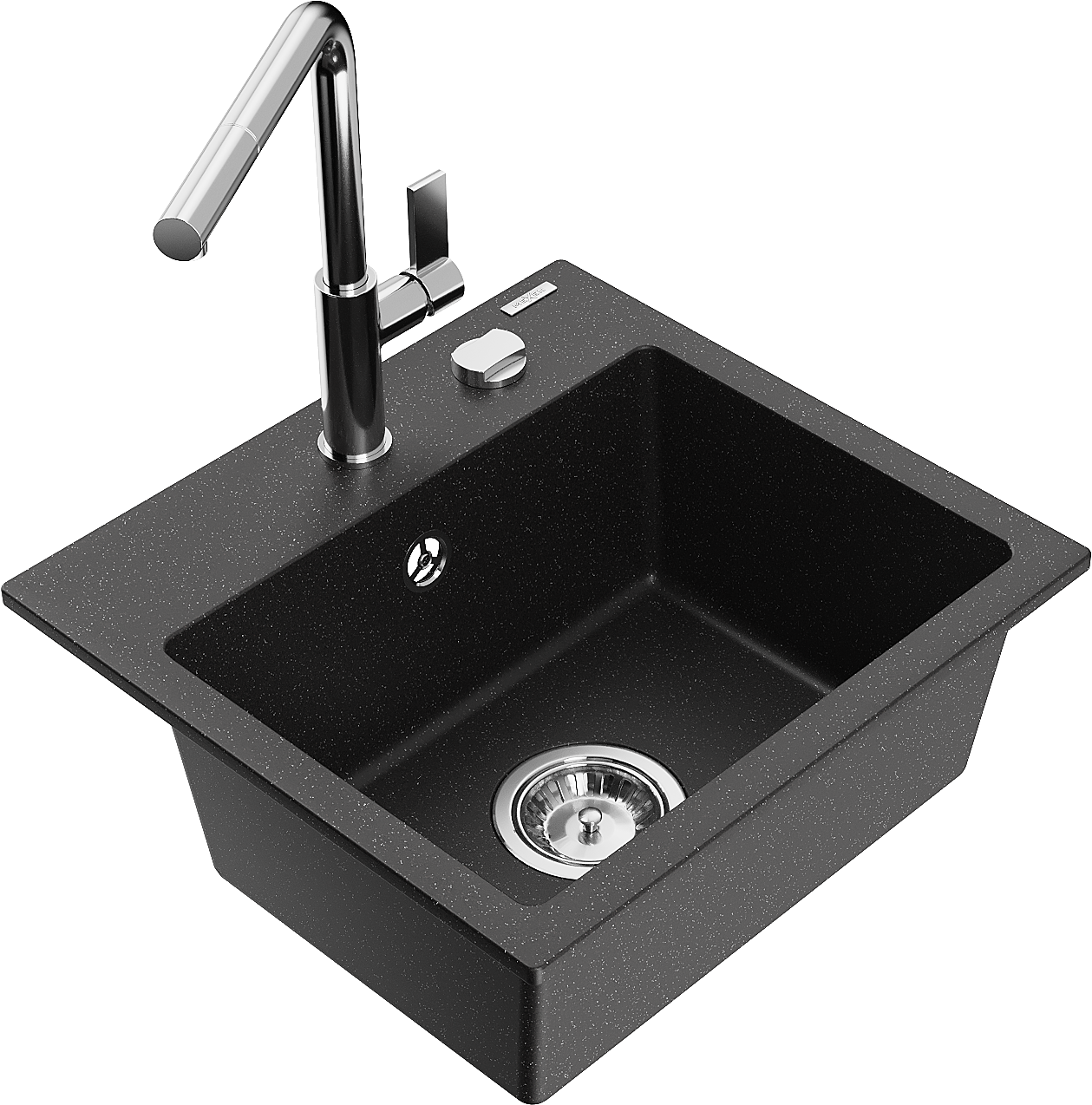 Mexen Milo granitový dřez 1-komorový s kuchyňskou baterií Flora, černý/stříbrný metalik - 6505-73-670401-00