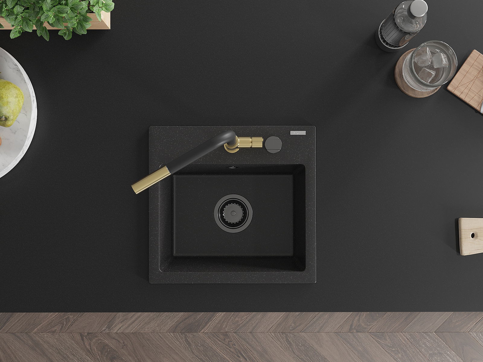 • Mexen Milo granitový dřez 1-komorový s kuchyňskou baterií Flora, černý/stříbrný metalik - 6505-73-670401-57-B