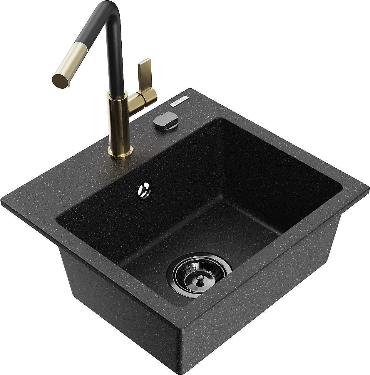 Mexen Milo granitový dřez 1-komorový s kuchyňskou baterií Flora, černý/stříbrný metalik - 6505-73-670401-57-B