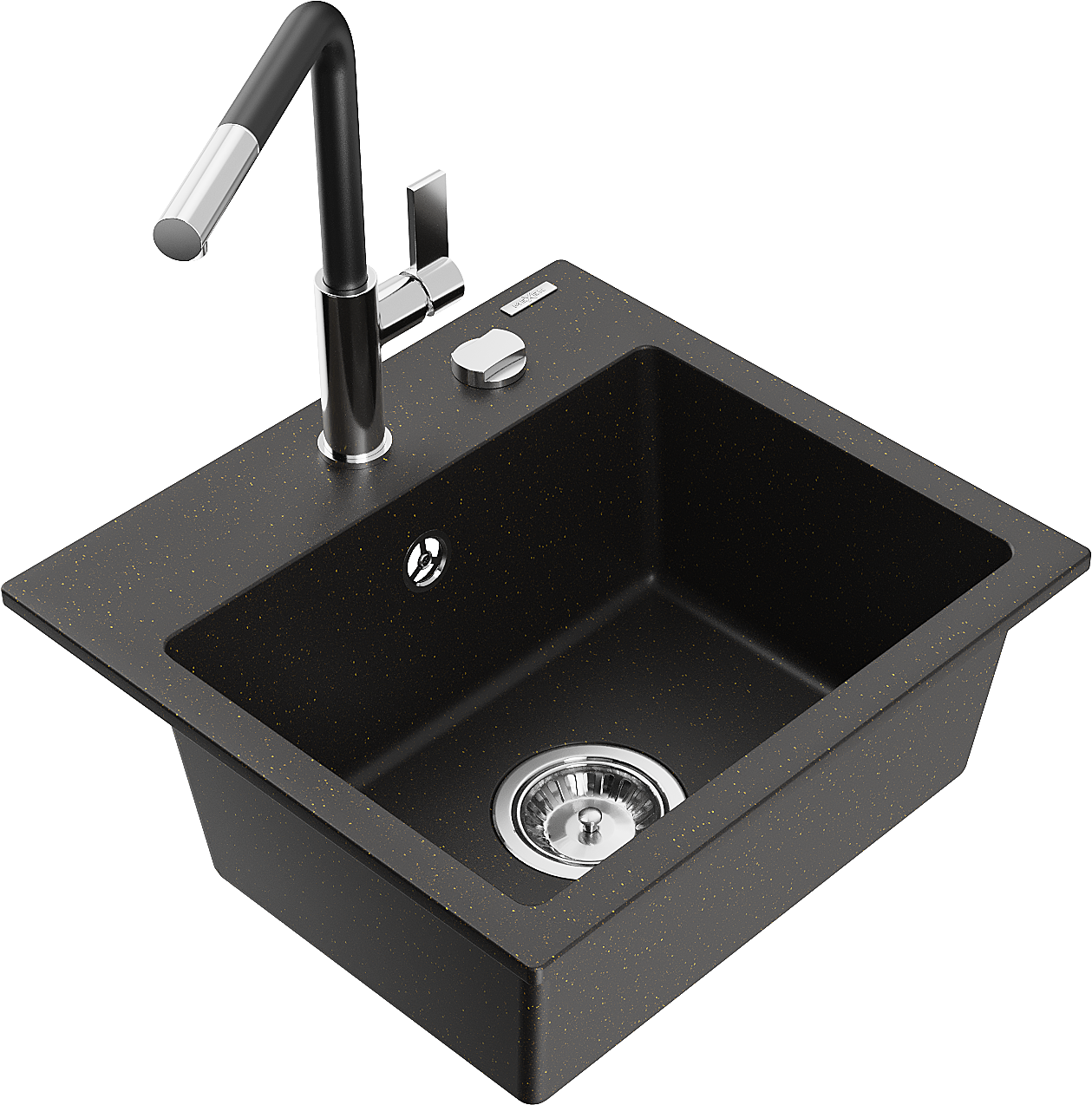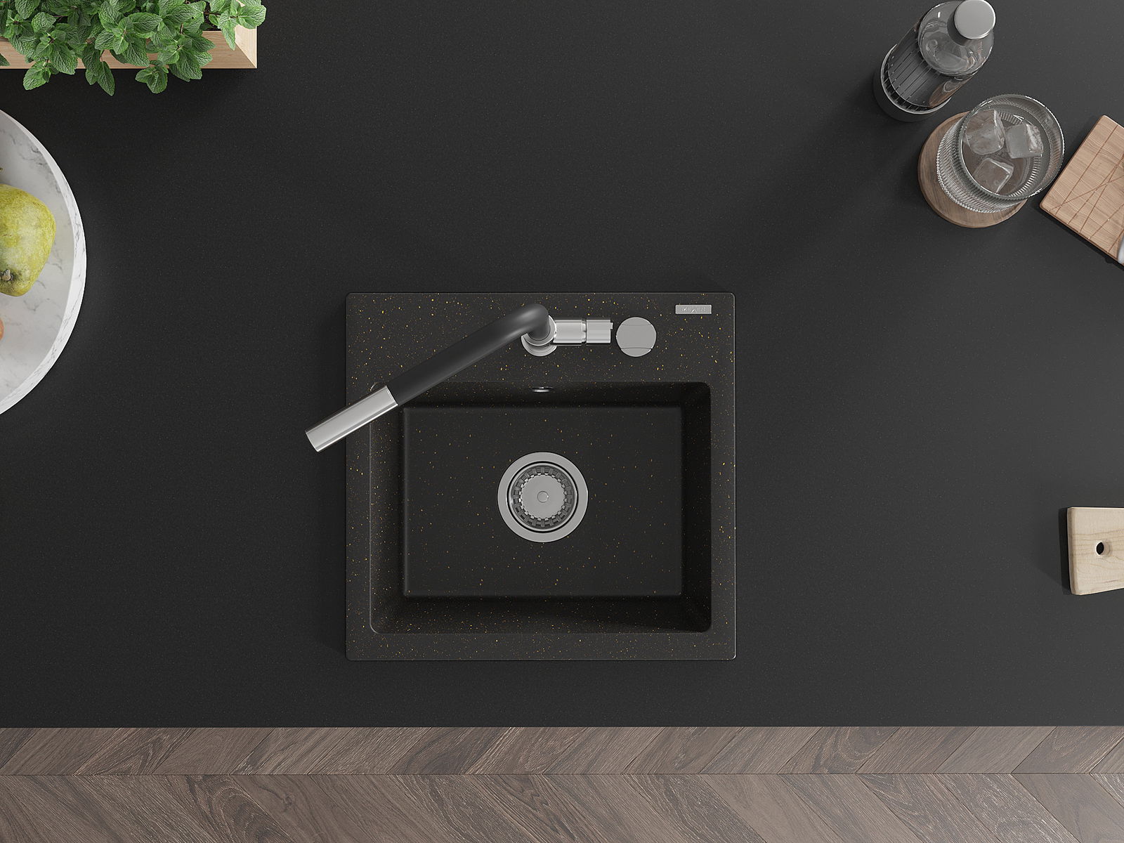 Mexen Milo granitový dřez 1-komorový s kuchyňskou baterií Flora, černý/zlatý metalík - 6505-75-670401-07