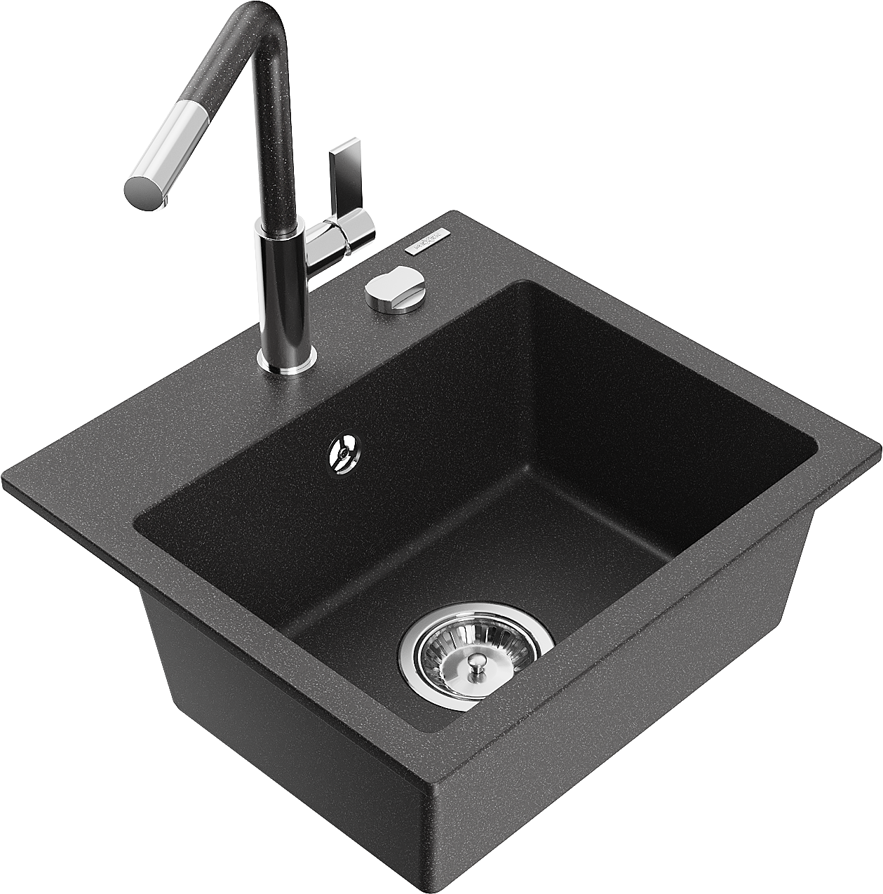 Mexen Milo granitový dřez 1-komorový s kuchyňskou baterií Flora, černý/zlatý metalický - 6505-76-670401-08