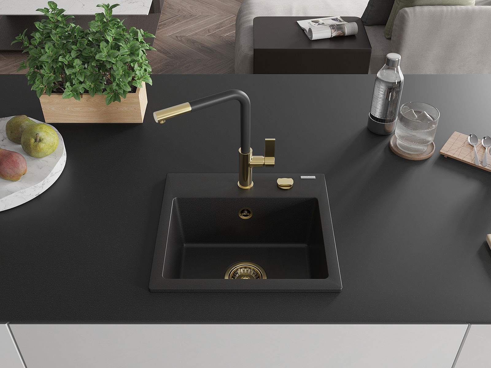 Dřez má předfrézovaný otvor o průměru 35 mm k samostatnému proražení. Může být použit například k montáži dávkovače na tekutinu, který eliminuje přítomnost plastových lahví v kuchyni a dodá jí elegantní finiš.