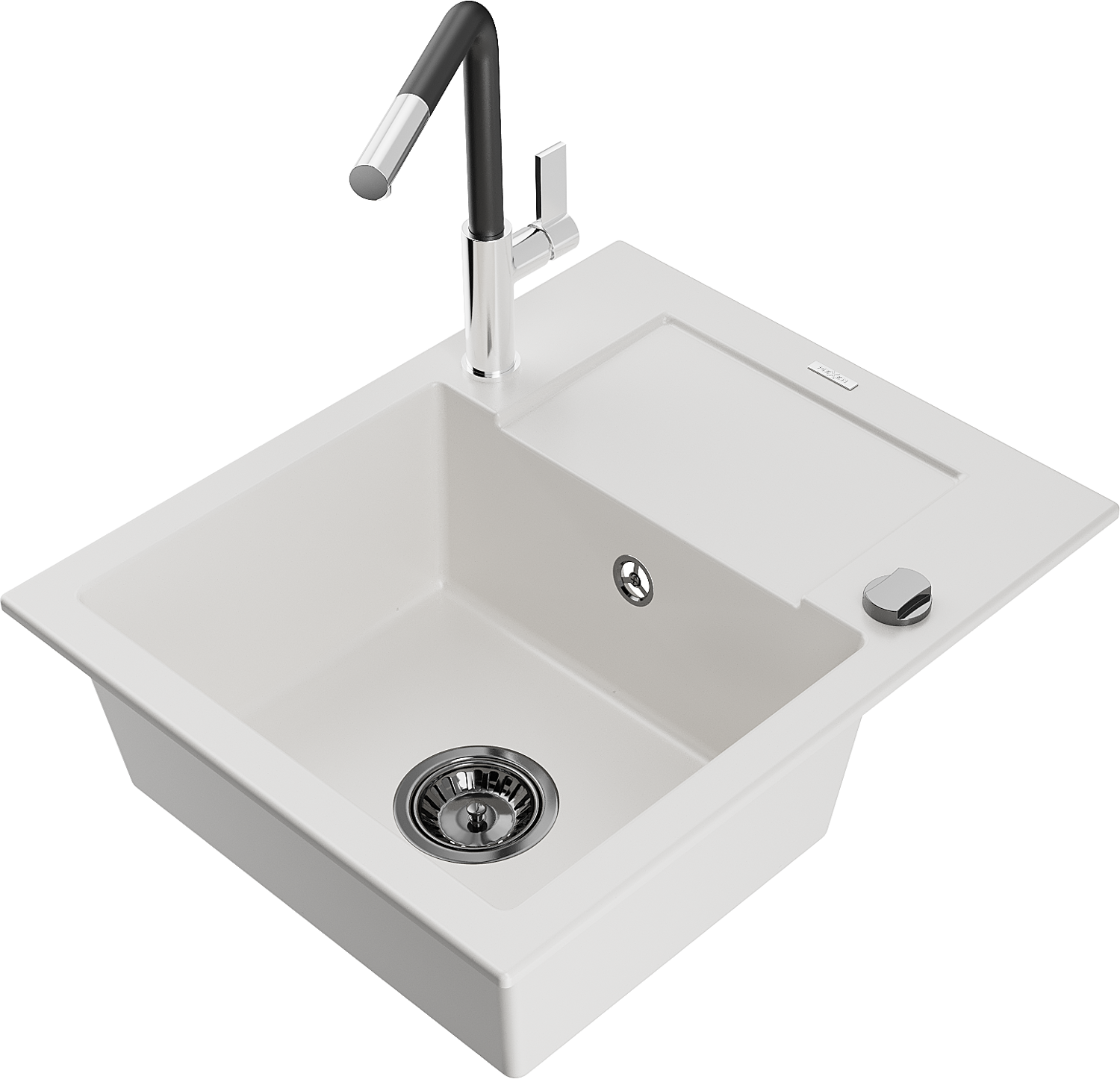 Mexen Enzo granitový dřez 1-komorový s odkapávačem a kuchyňskou baterií Flora, bílý - 6506-20-670401-07-B