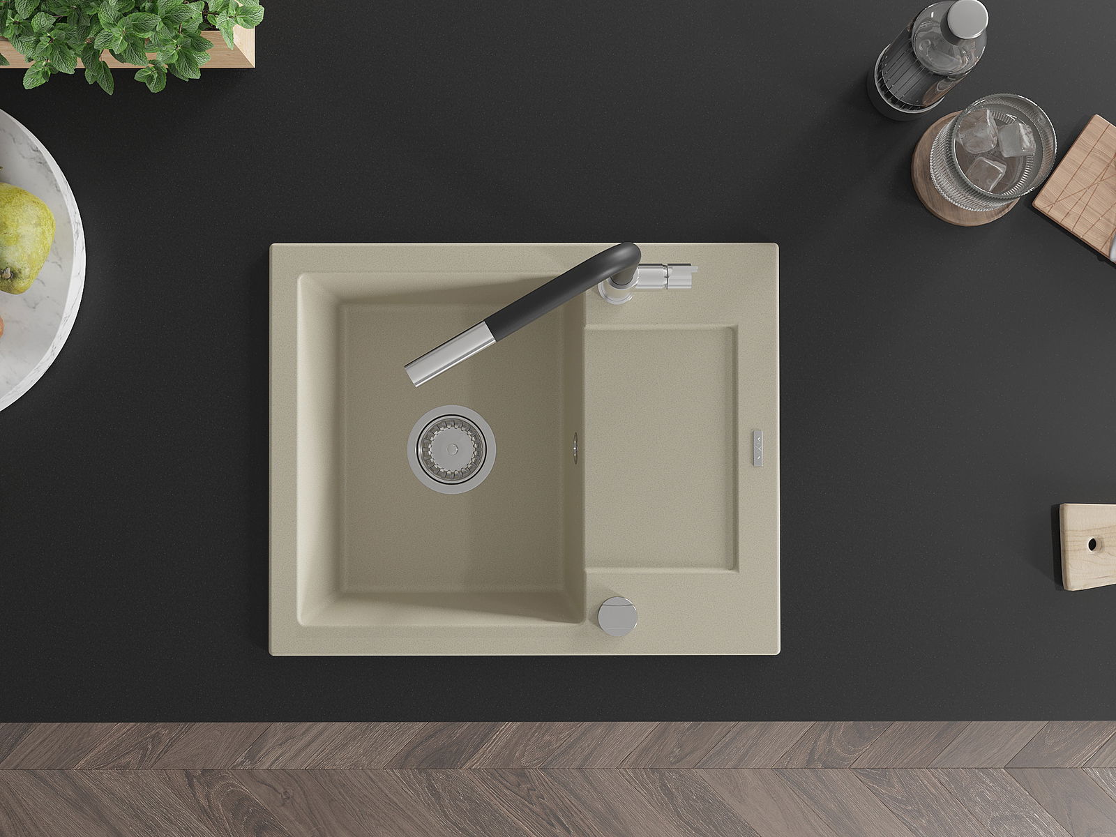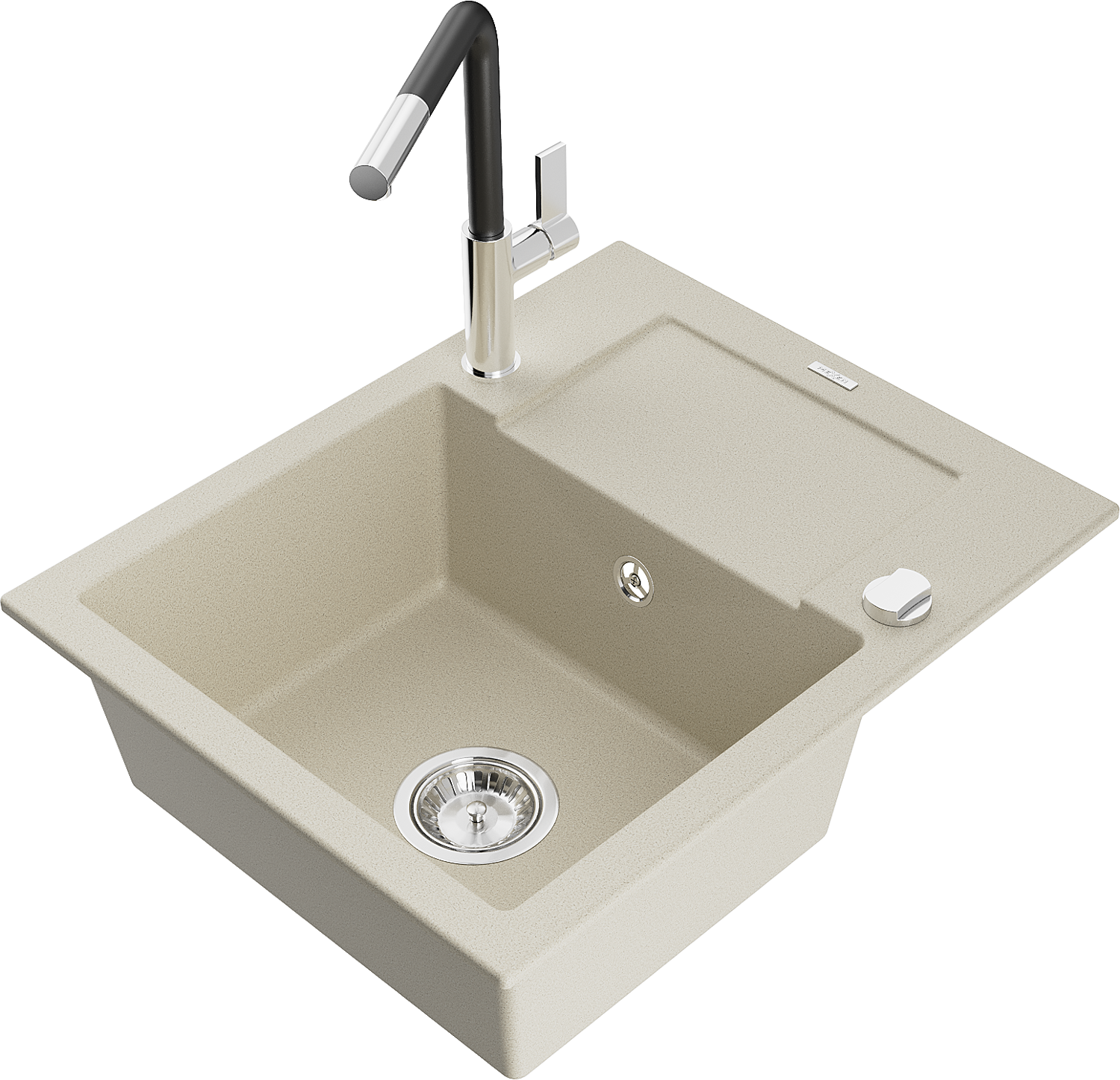 Mexen Enzo granitový dřez 1-komorový s odkapávačem a kuchyňskou baterií Flora, béžový - 6506-69-670401-07