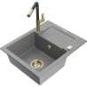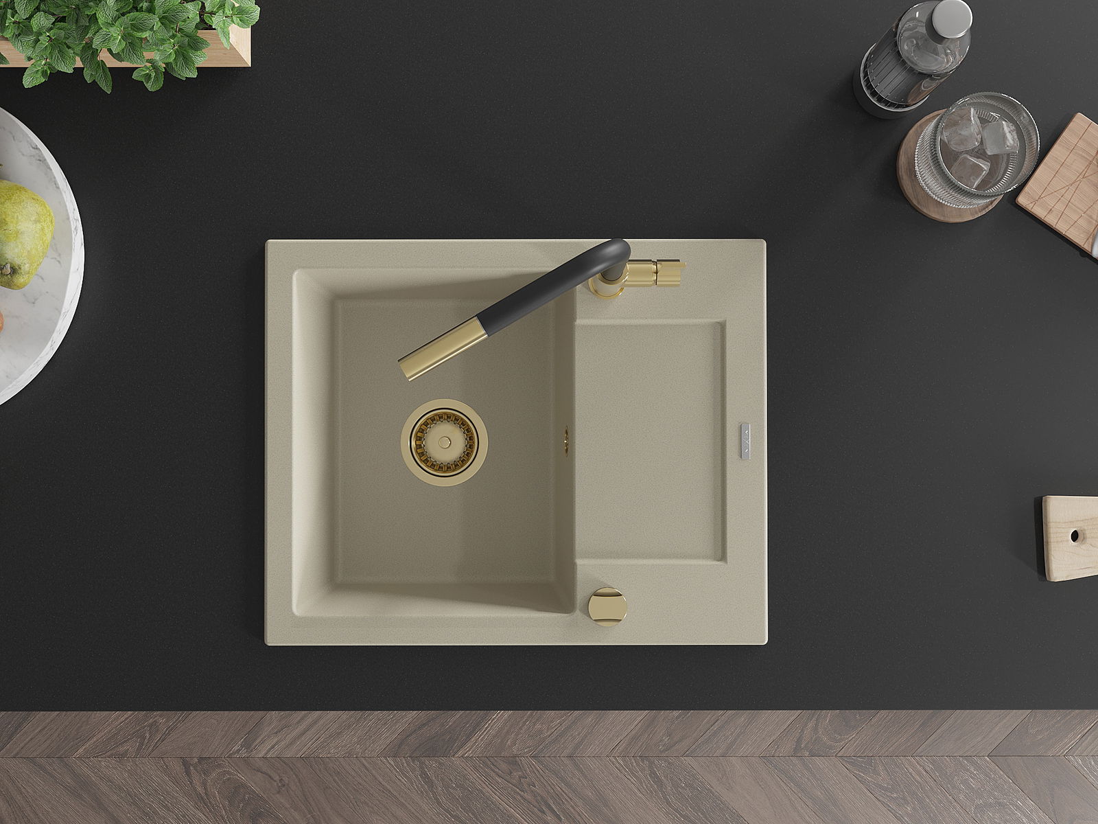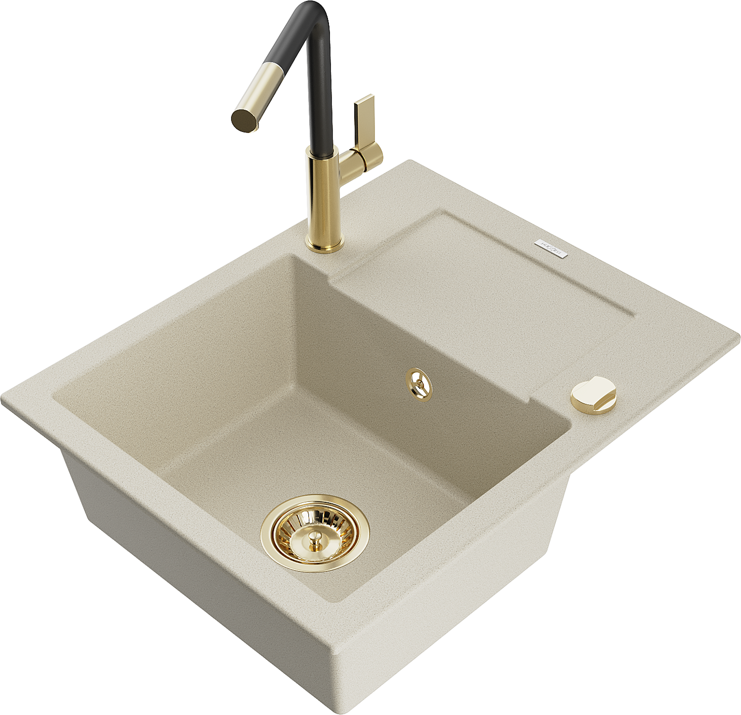 Mexen Enzo granitový dřez s 1 komorou, s odkapávačem a kuchyňskou baterií Flora, béžový - 6506-69-670401-57-G