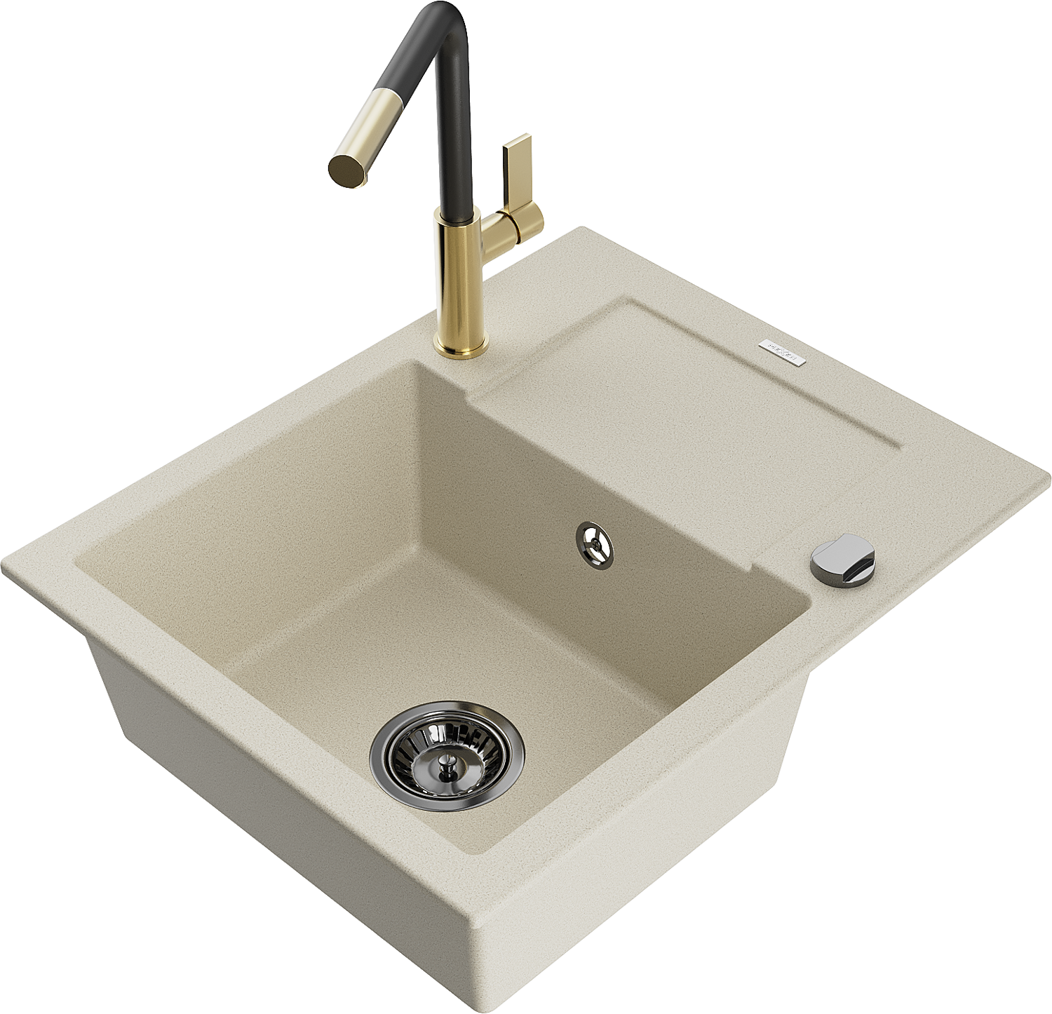 Mexen Enzo granitový dřez 1-komorový s odkapávačem a kuchyňskou baterií Flora, béžový - 6506-69-670401-57-B