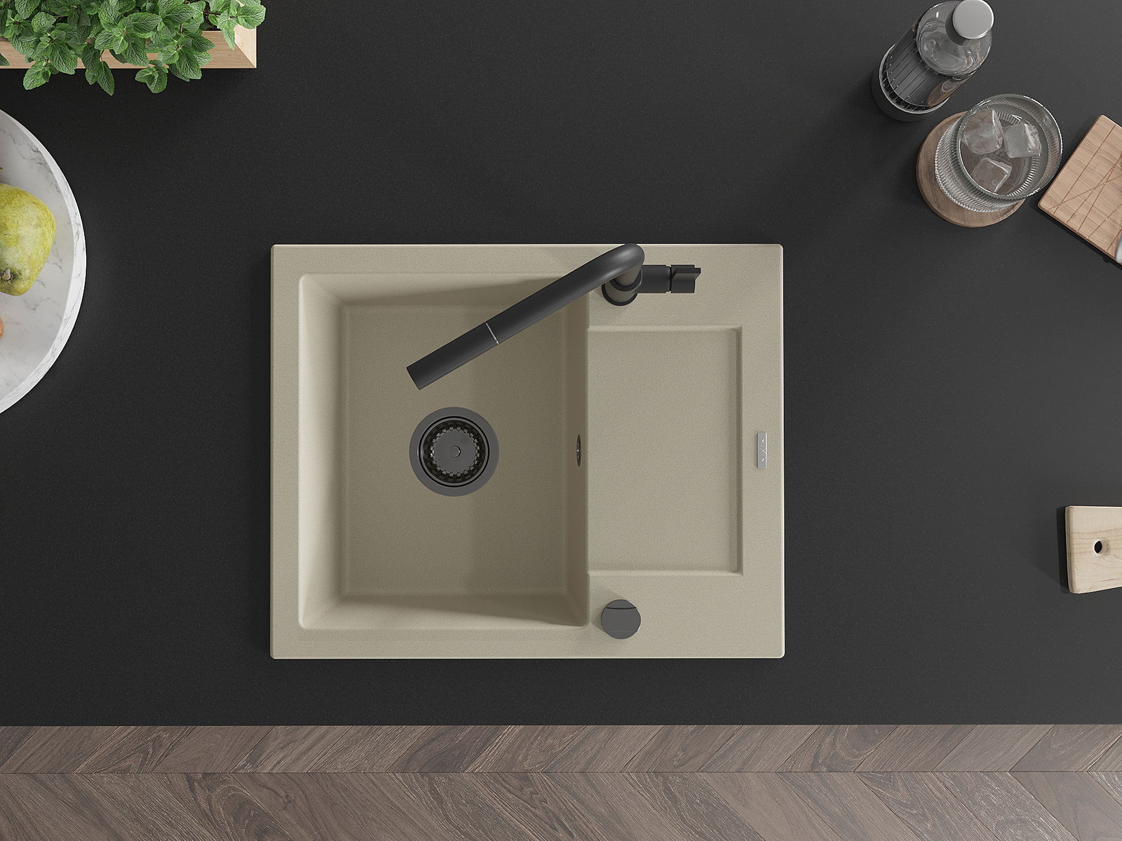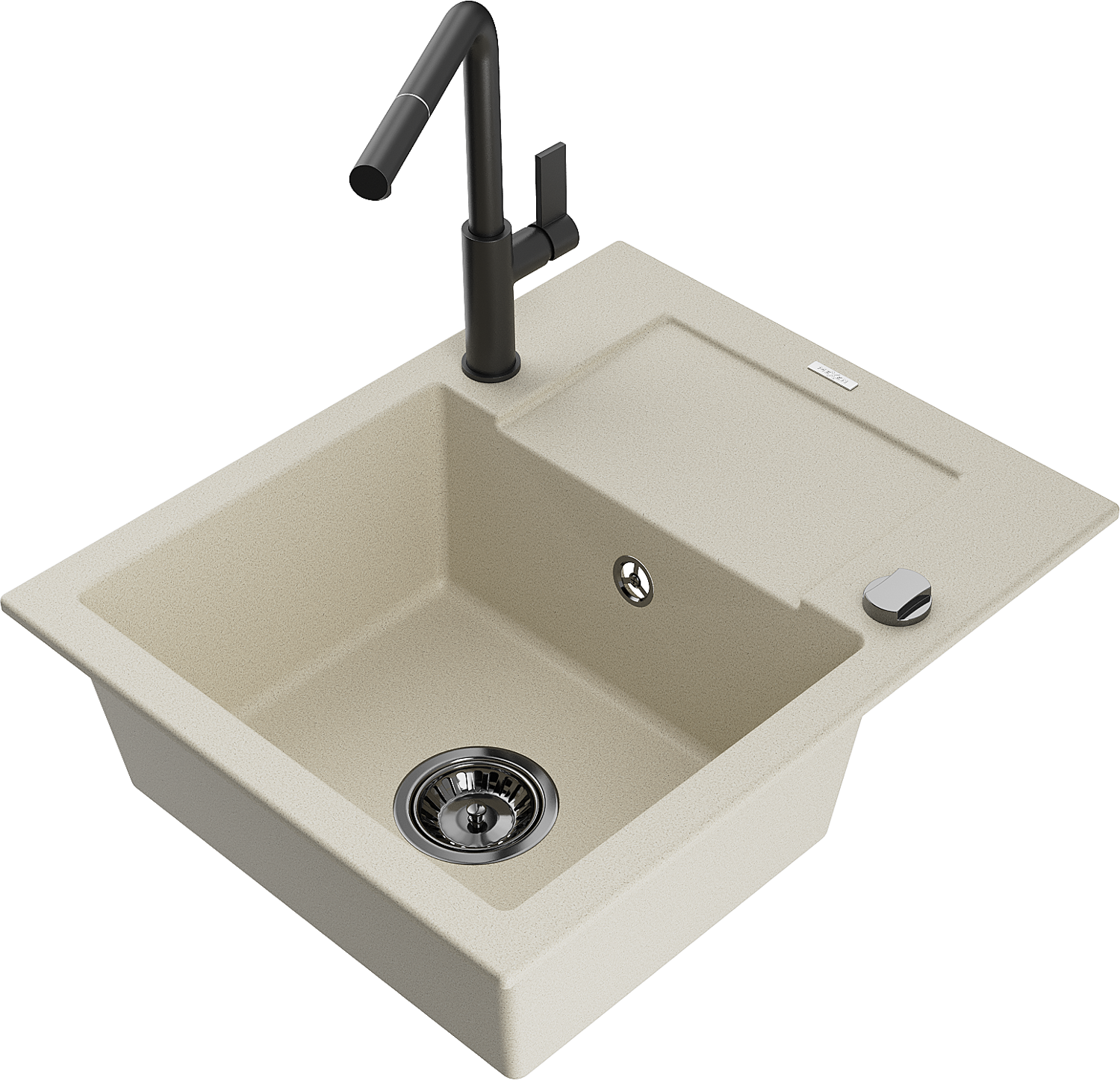 Mexen Enzo granitový dřez 1-komorový s odkapávačem a kuchyňskou baterií Flora, béžový - 6506-69-670401-70-B