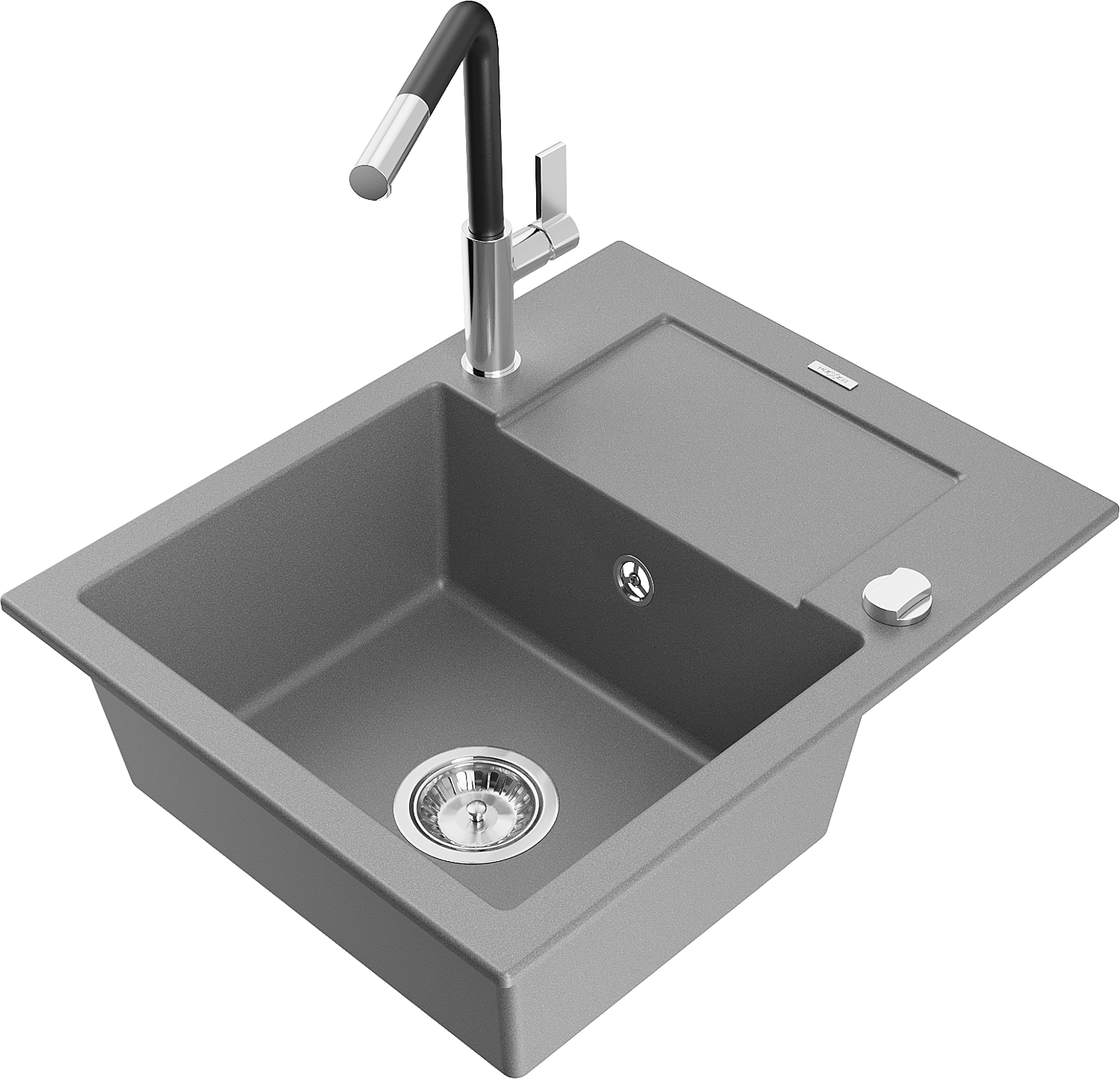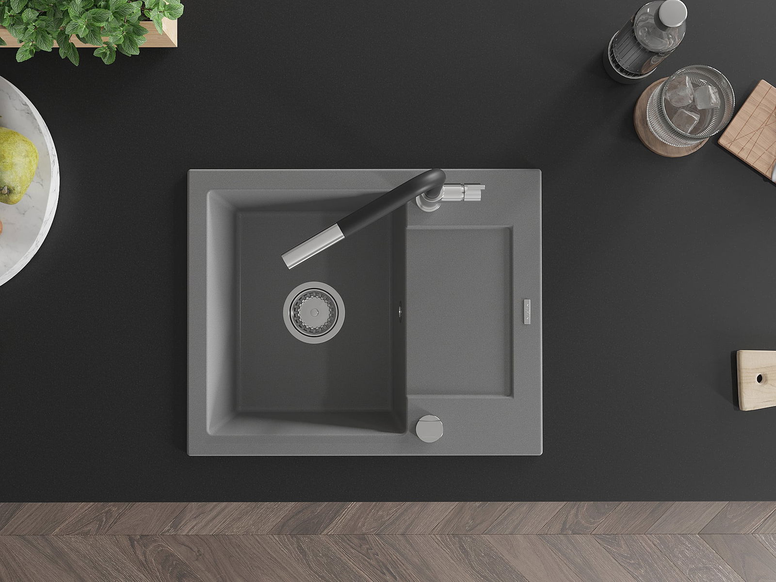 Mexen Enzo granitový dřez 1-komorový s odkapávačem a kuchyňskou baterií Flora, šedý - 6506-71-670401-07