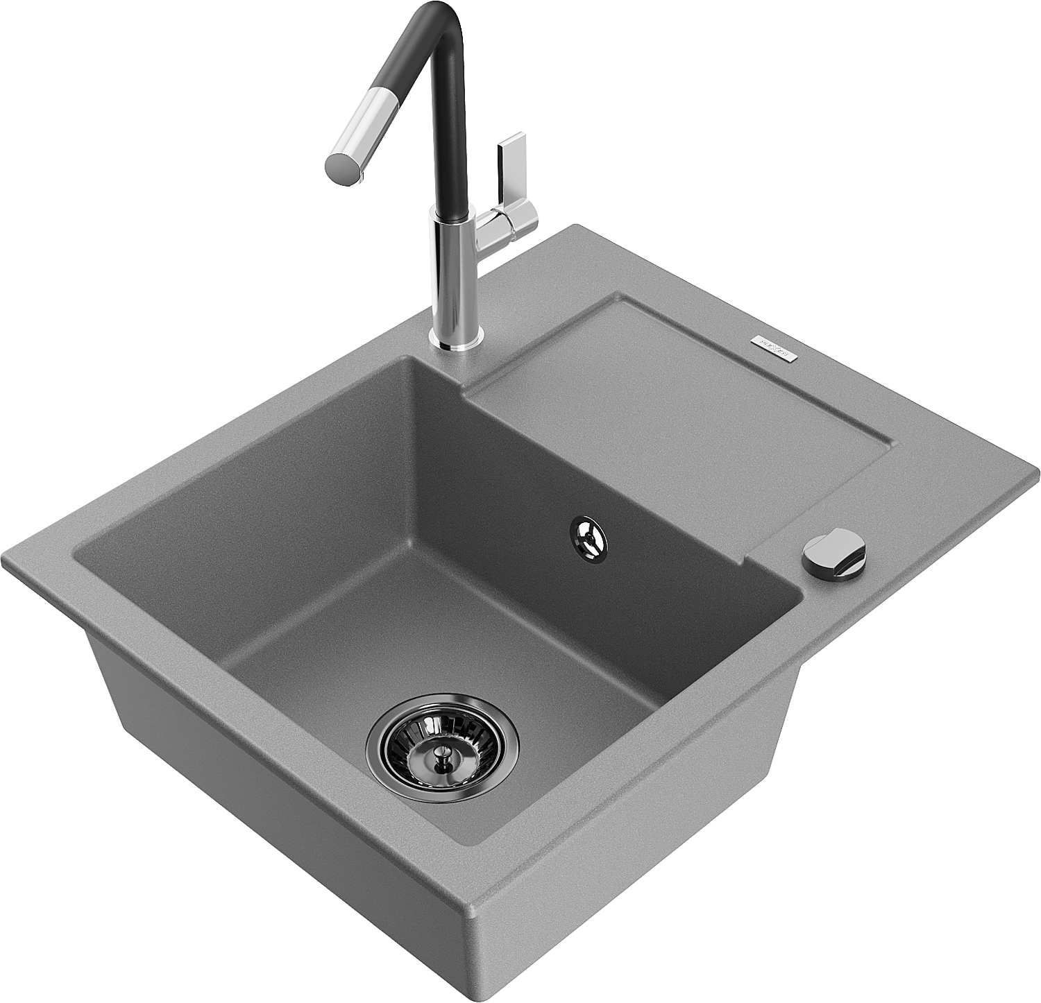 Mexen Enzo granitový dřez 1-komorový s odkapávačem a kuchyňskou baterií Flora, šedý - 6506-71-670401-07-B