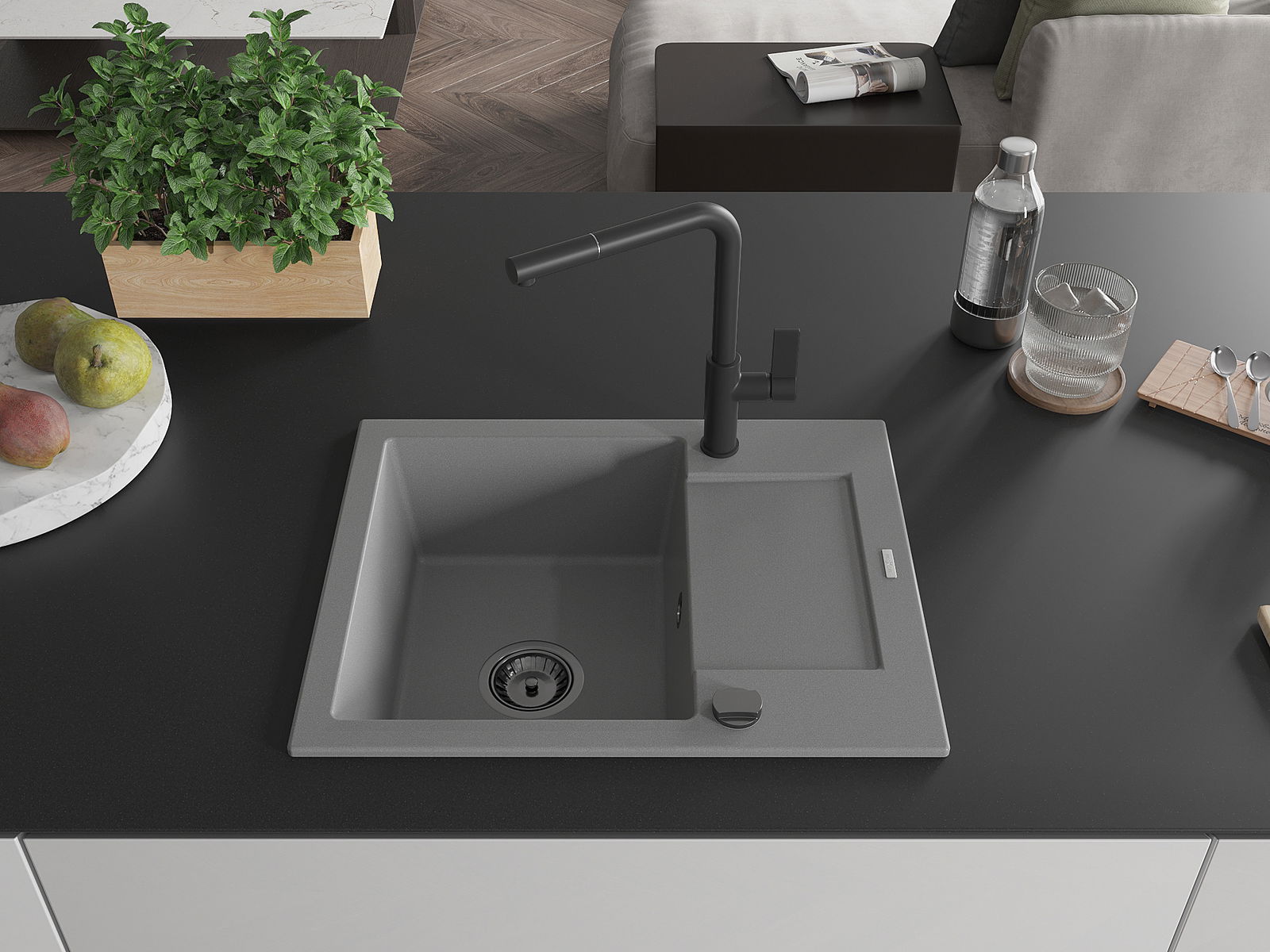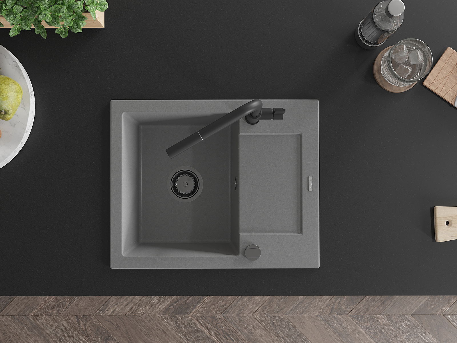 Mexen Enzo granitový dřez s 1 komorou a odkapávačem a kuchyňskou baterií Flora, šedá - 6506-71-670401-70-B