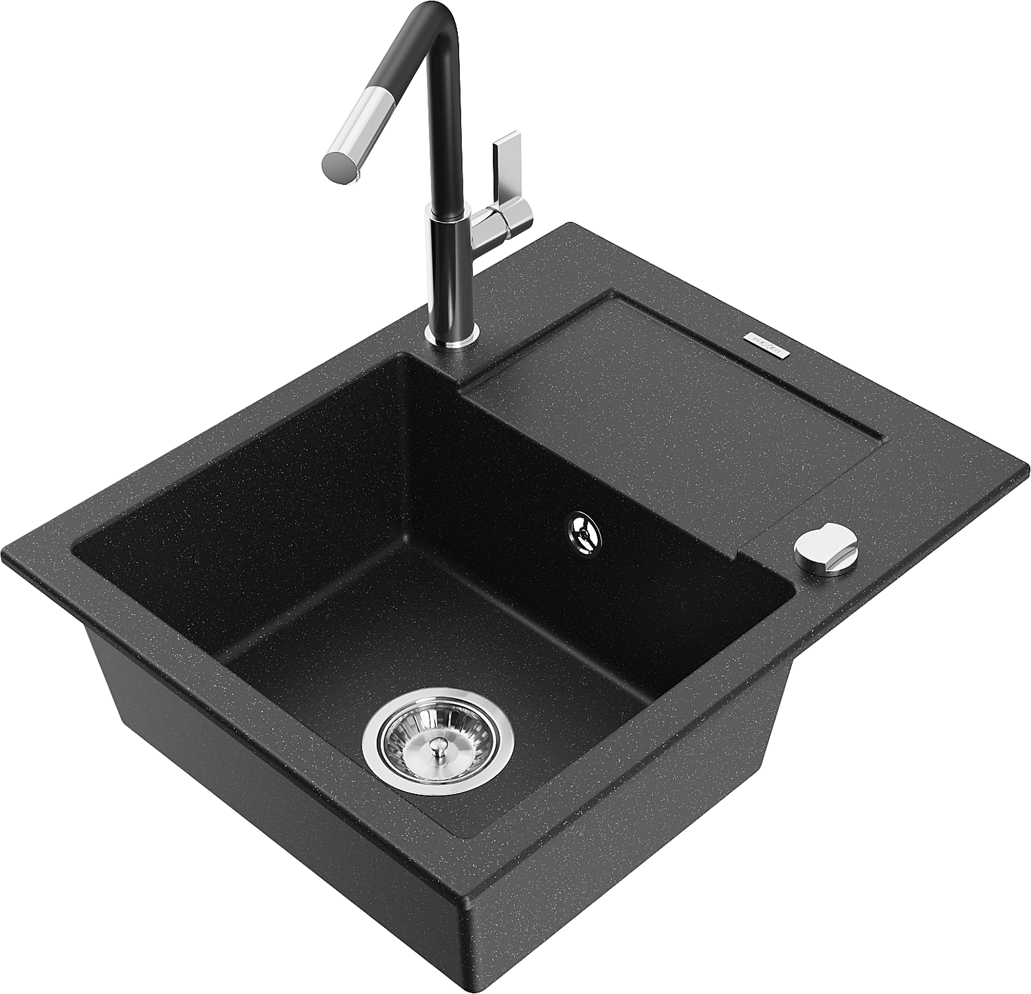 Mexen Enzo granitový dřez 1-komorový s odkapávačem a kuchyňskou baterií Flora, černý/stříbrný metalik - 6506-73-670401-07