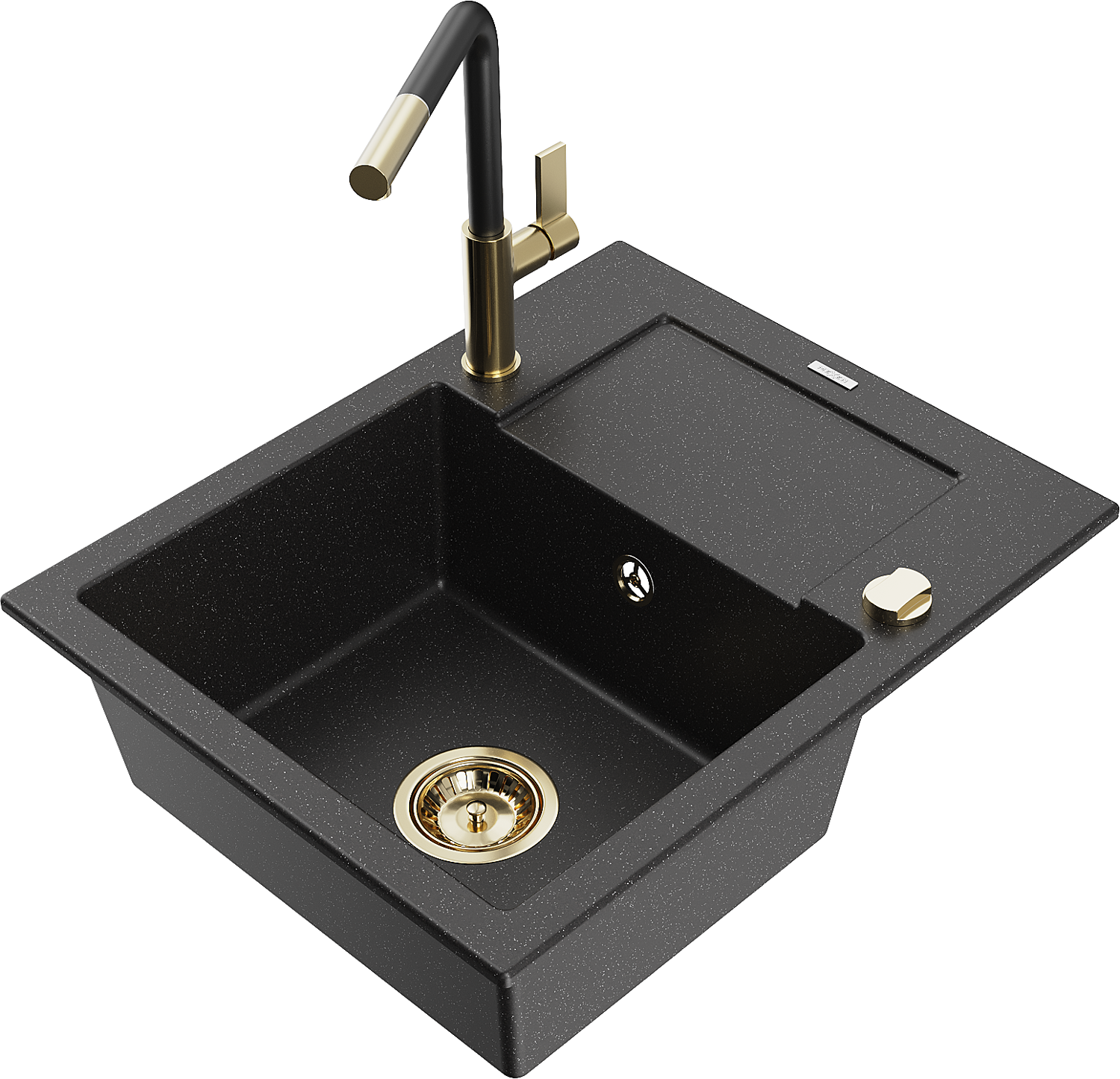 Mexen Enzo granitový dřez 1-komorový s odkapávačem a kuchyňskou baterií Flora, černý/stříbrný metalik - 6506-73-670401-57-G