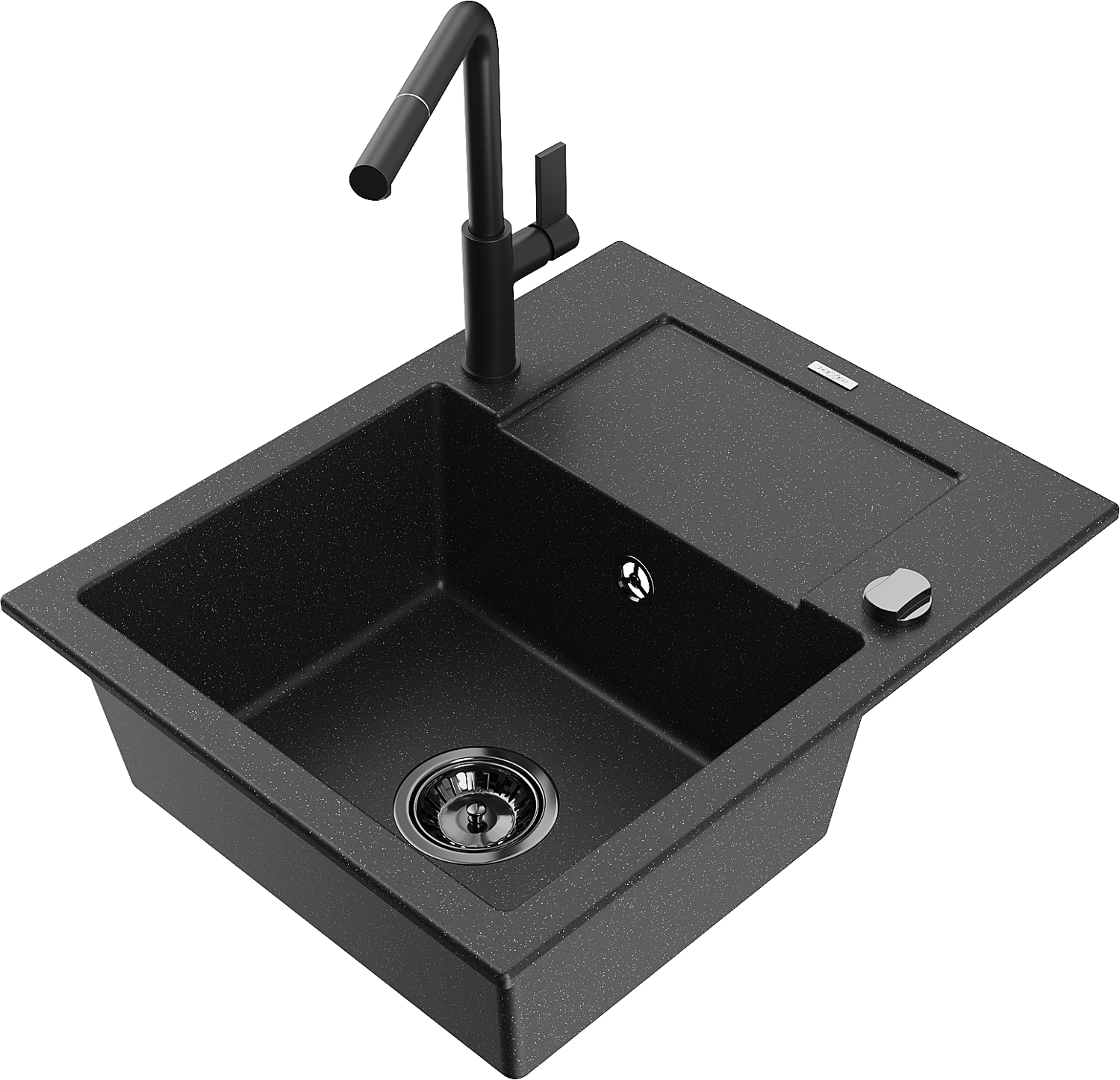Mexen Enzo granitový dřez 1-komorový s odkapávačem a kuchyňskou baterií Flora, černý/stříbrný metalik - 6506-73-670401-70-B