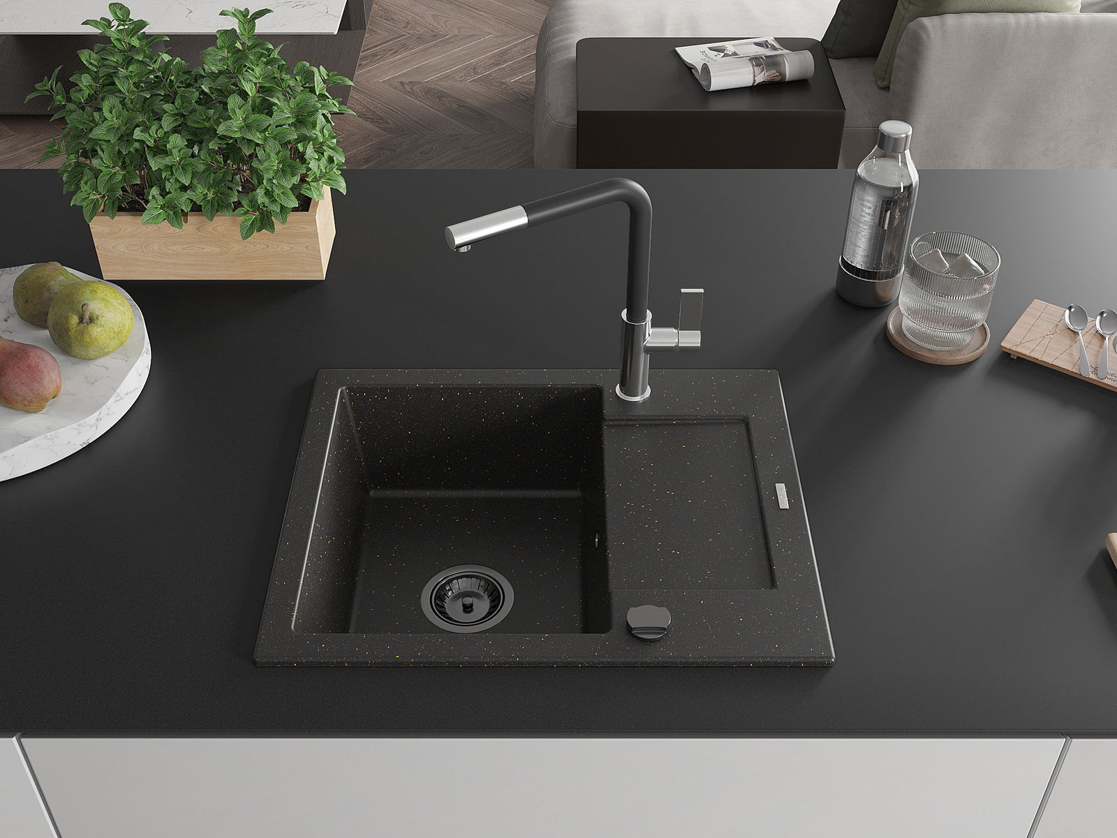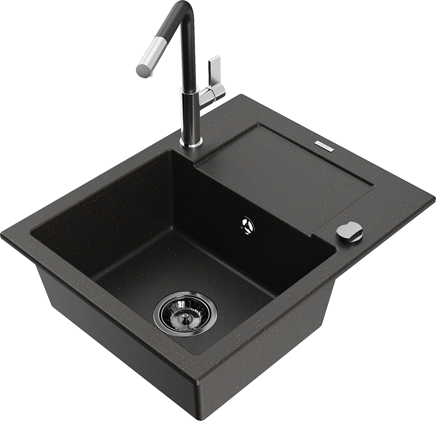 Mexen Enzo granitový dřez s 1 komorou a odkapávačem a kuchyňskou baterií Flora, černý/zlatý metalik - 6506-75-670401-07-B