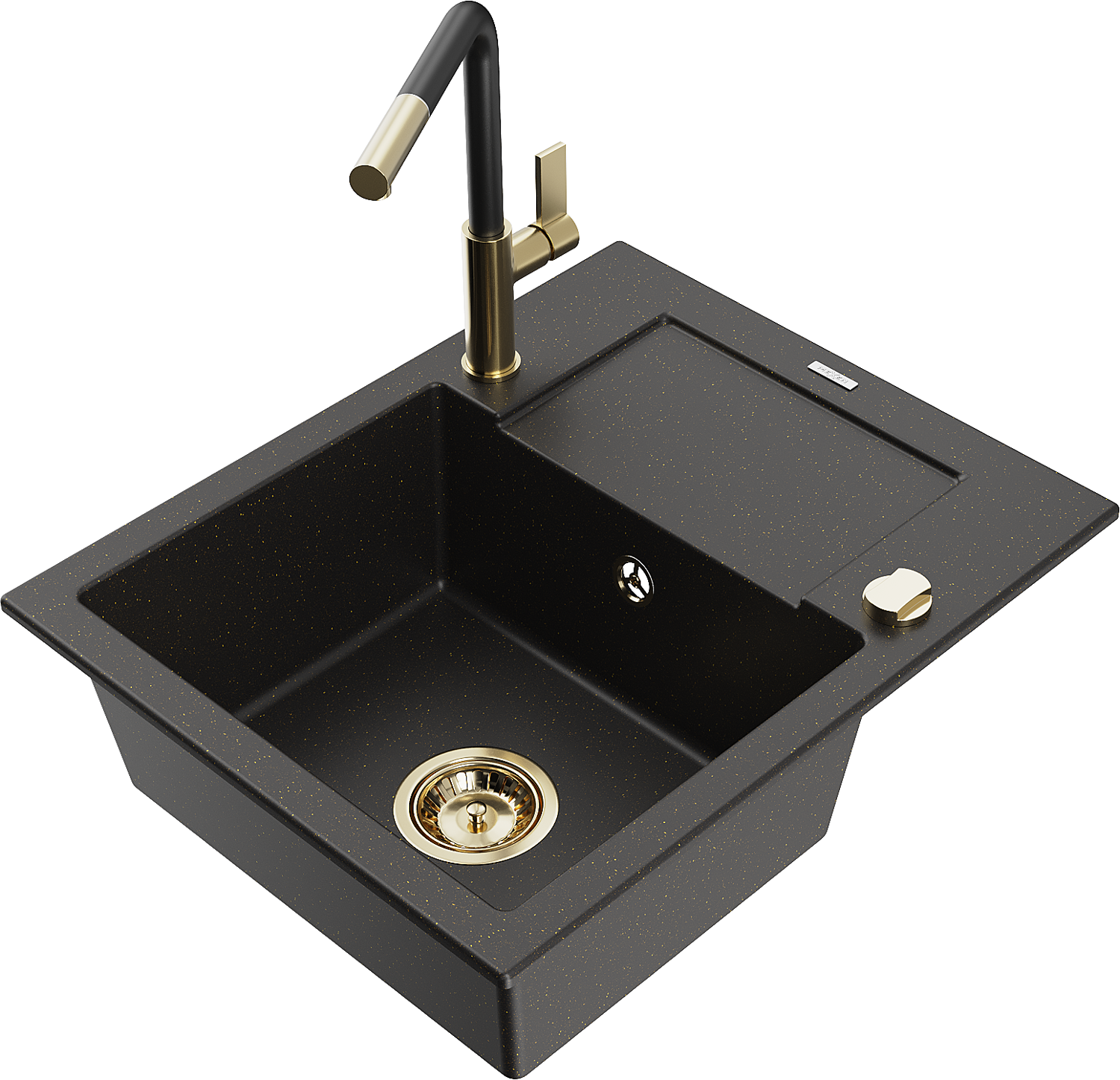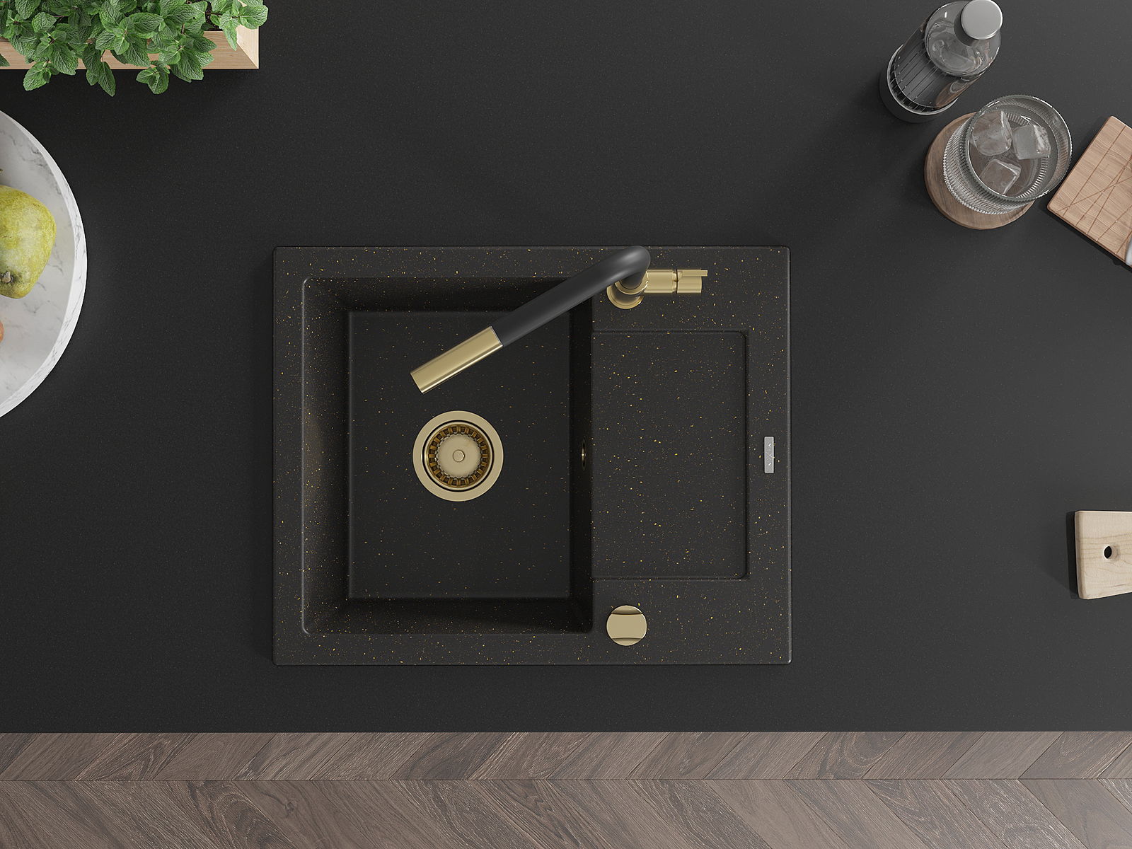 Mexen Enzo granitový dřez 1-komorový s odkapávačem a kuchyňskou baterií Flora, černý/zlatý metalik - 6506-75-670401-57-G