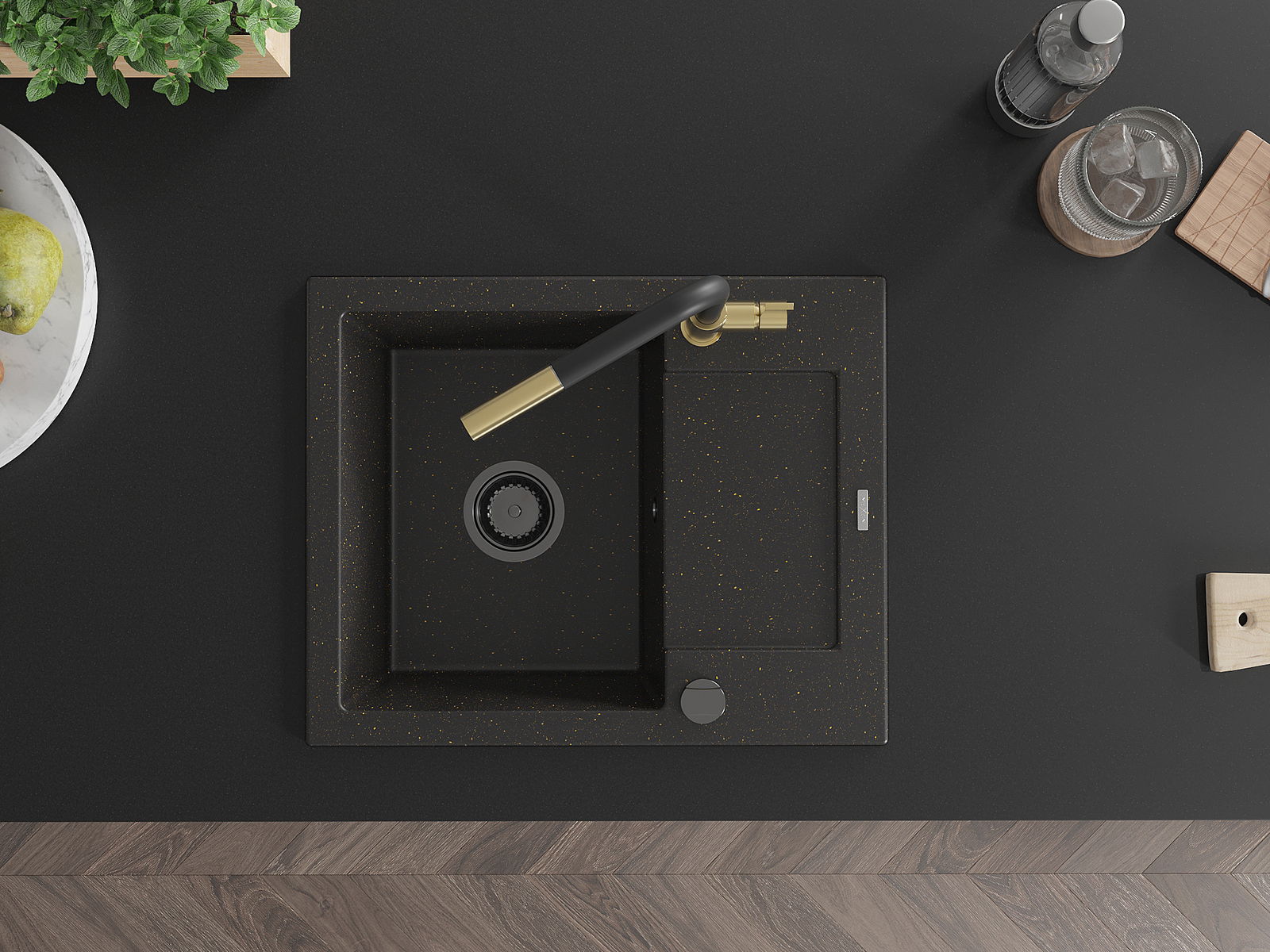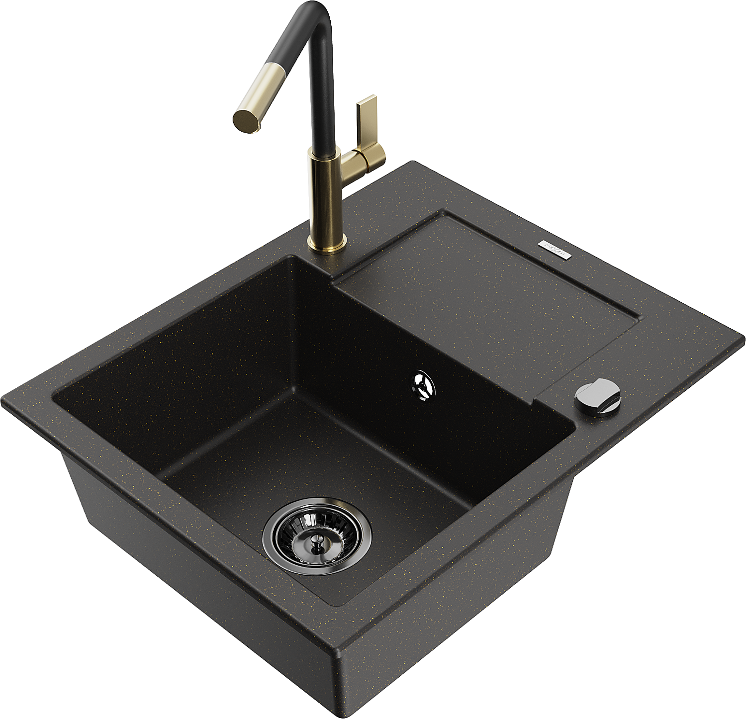 Mexen Enzo granitový dřez jednodřez s odkapávačem a kuchyňskou baterií Flora, černý/zlatý metalický - 6506-75-670401-57-B
