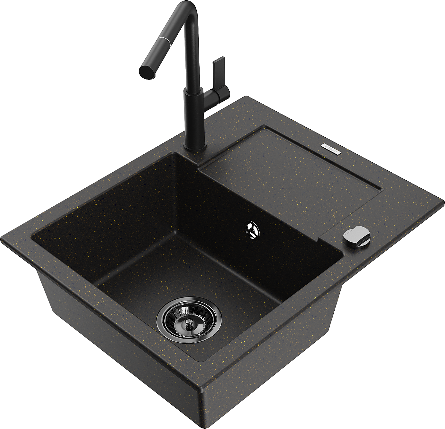 Mexen Enzo granitový dřez 1-komorový s odkapávačem a kuchyňskou baterií Flora, černý/zlatý metalický - 6506-75-670401-70-B
