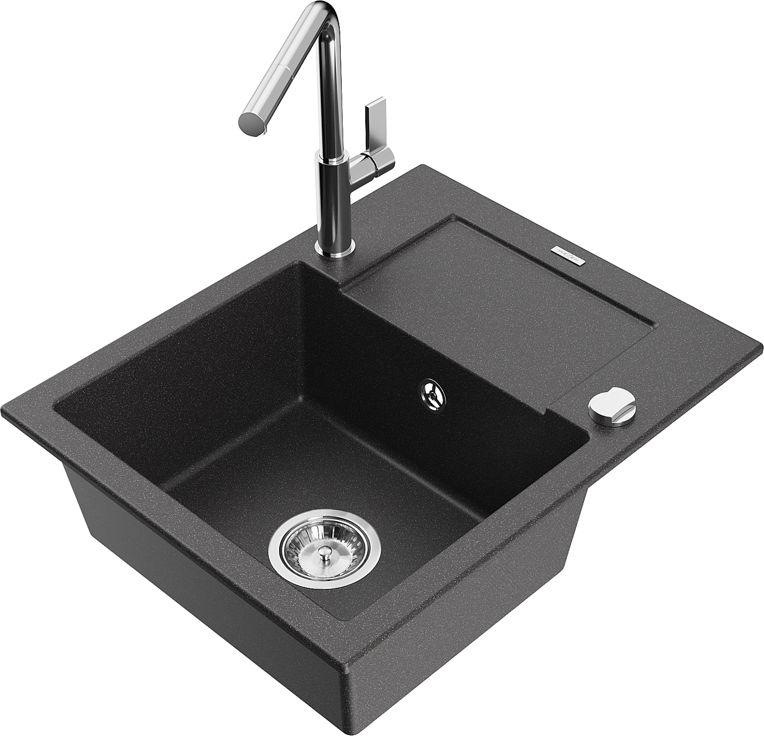 Mexen Enzo granitový dřez 1-komorový s odkapávačem a kuchyňskou baterií Flora, černý skvrnitý - 6506-76-670401-00