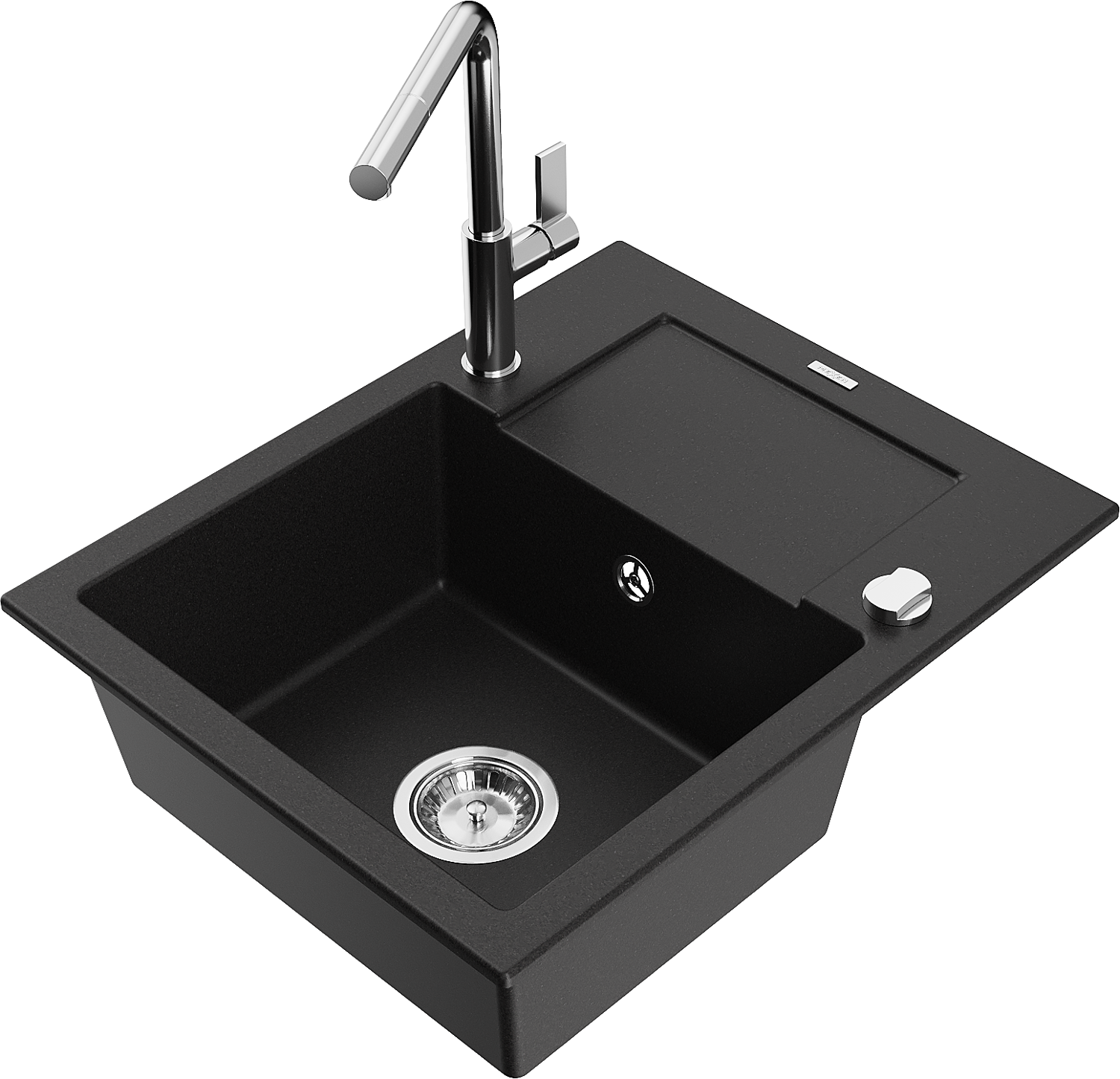 Mexen Enzo granitový dřez s 1 komorou s odkapávačem a kuchyňskou baterií Flora, černý - 6506-77-670401-00