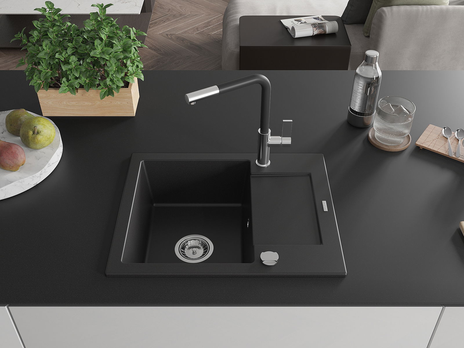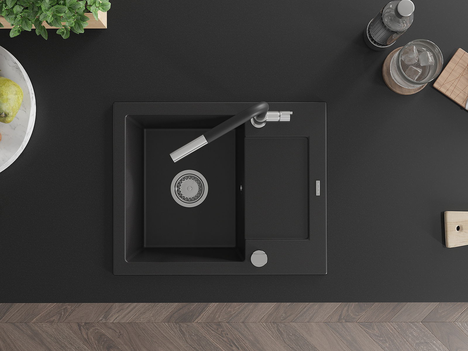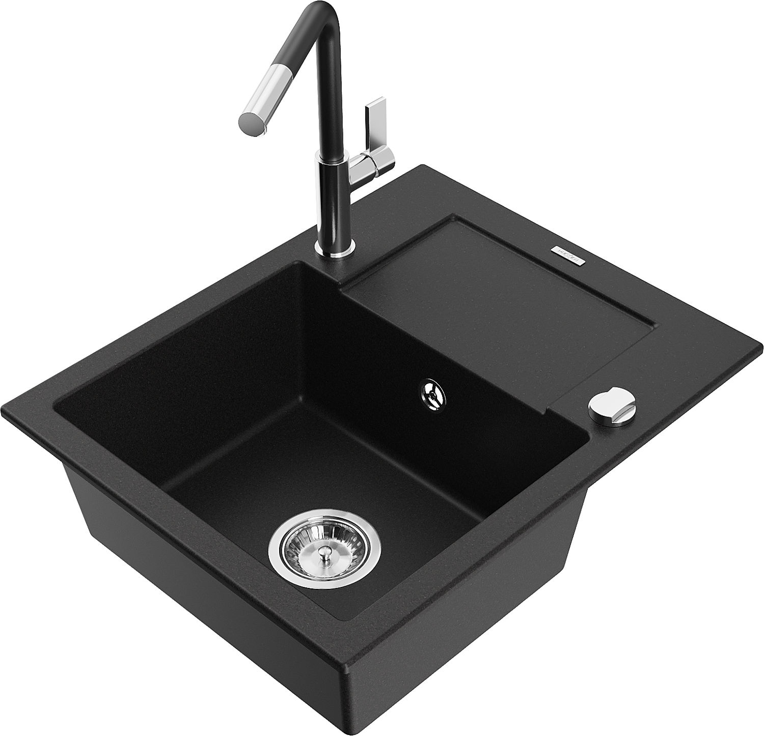 Mexen Enzo granitový dřez 1-komorový s odkapávačem a kuchyňskou baterií Flora, černý - 6506-77-670401-07