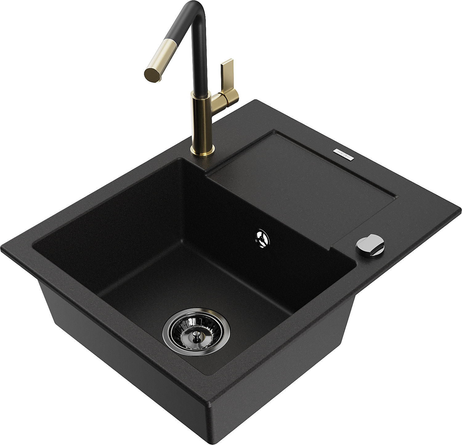 Mexen Enzo granitový dřez s 1 komorou a odkapávačem a kuchyňskou baterií Flora, černý - 6506-77-670401-57-B