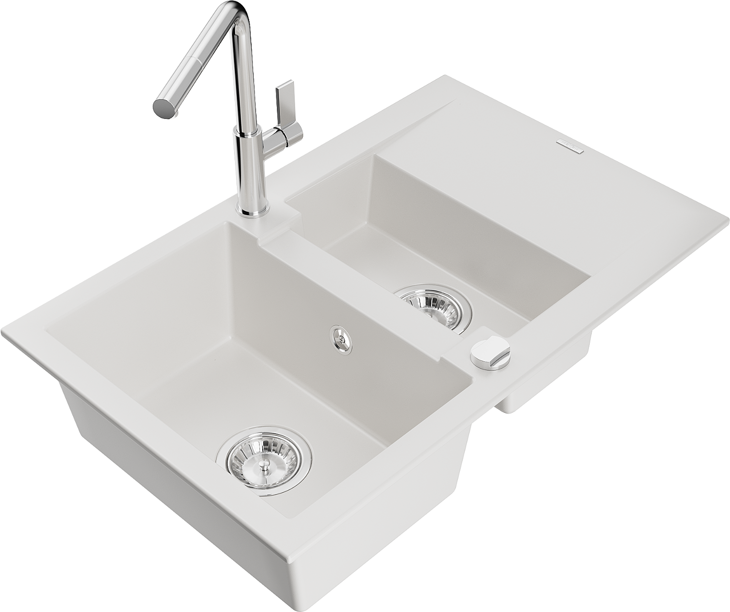 Mexen Gaspar žulový dřez 1,5-komorový s odkapávačem a kuchyňskou baterií Flora, bílý - 6507-20-670401-00