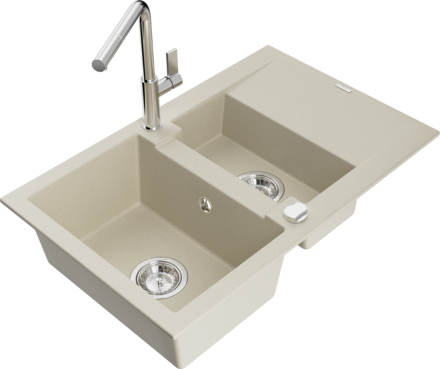 Mexen Gaspar granitový dřez 1,5-komorový s odkapávačem a kuchyňskou baterií Flora, béžový - 6507-69-670401-00