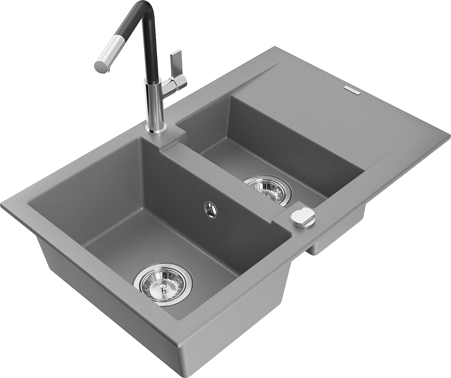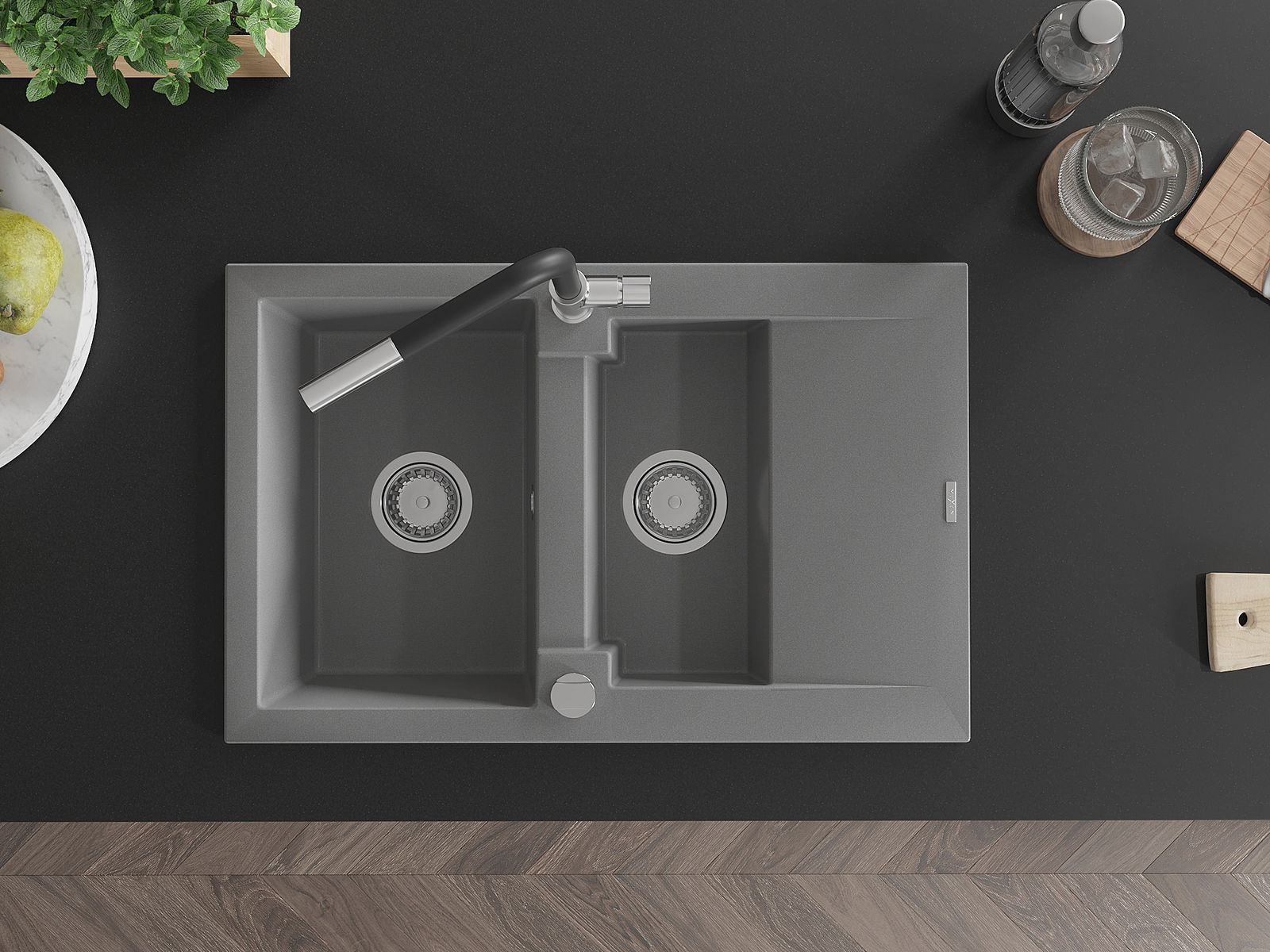 Mexen Gaspar granitový dřez 1,5-komorový s odkapávačem a kuchyňskou baterií Flora, šedý - 6507-71-670401-07