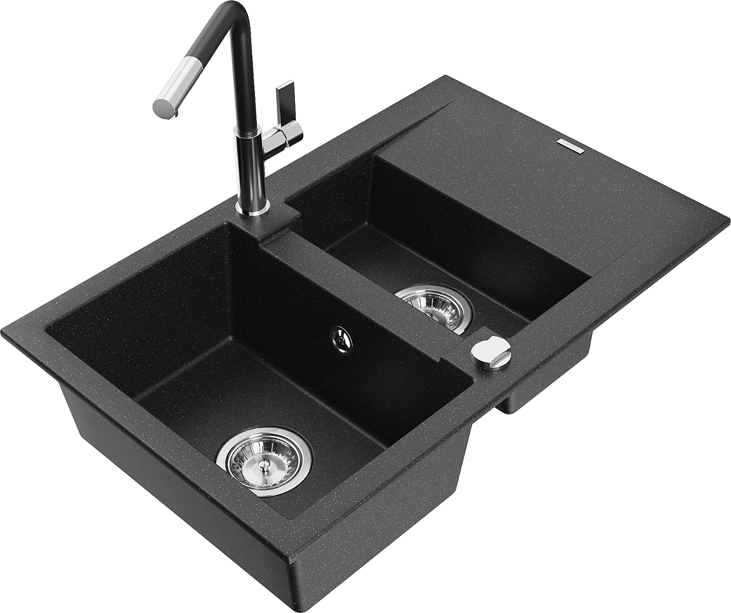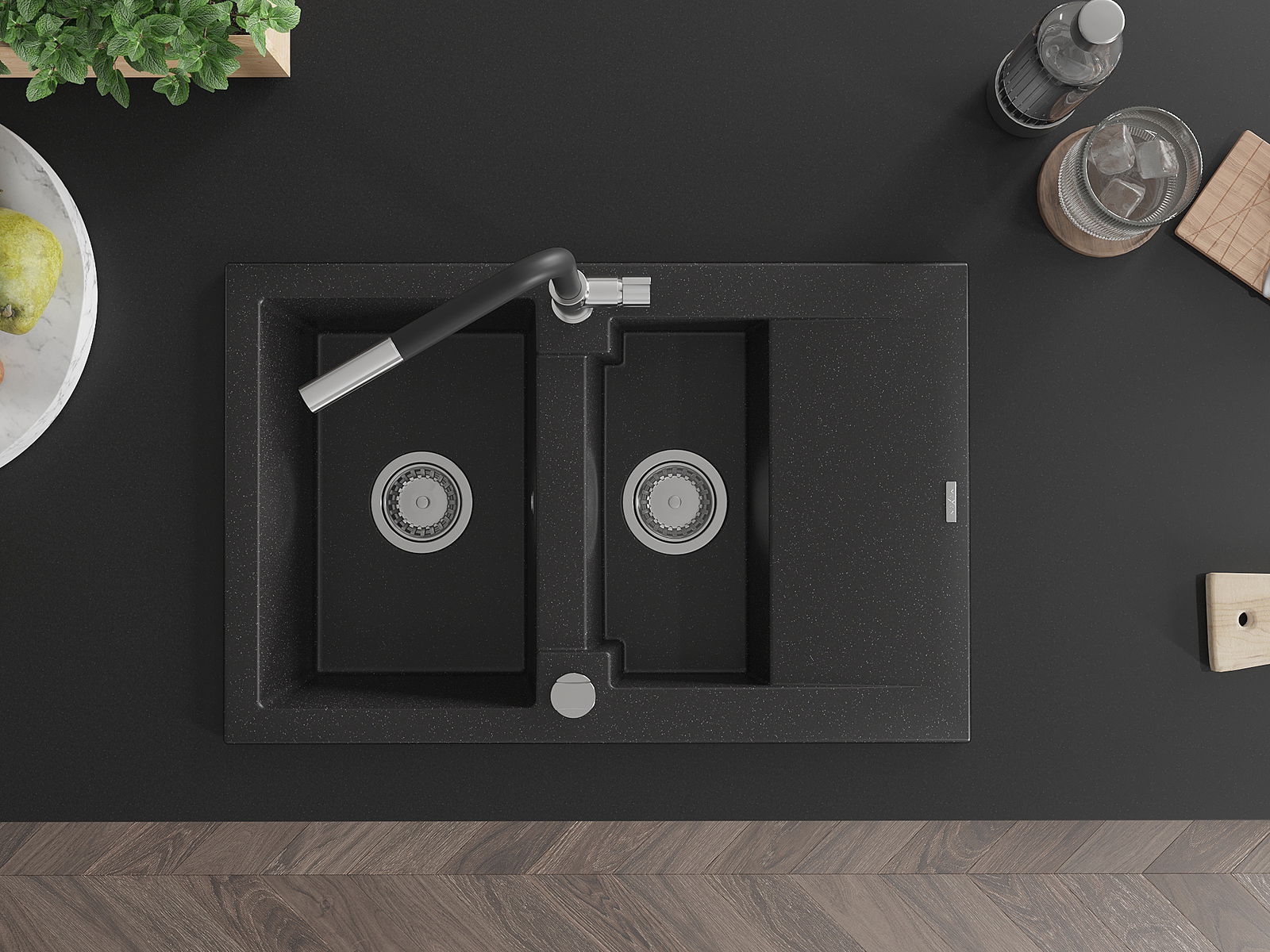 Mexen Gaspar granitový dřez 1,5-komorový s odkapávačem a kuchyňskou baterií Flora, černý/stříbrný - 6507-73-670401-07